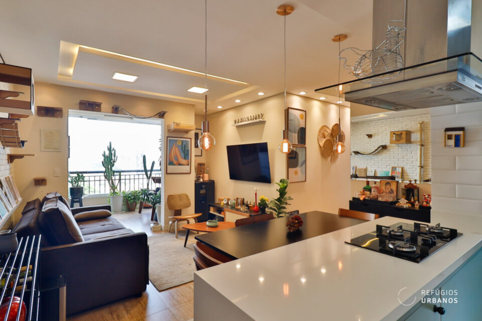 Por essa razão ela reconfigurou todo o layout do apartamento. Sala e cozinha foram integrados, assim como sala e varanda.