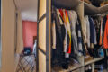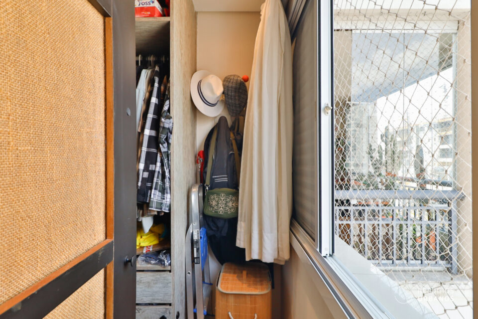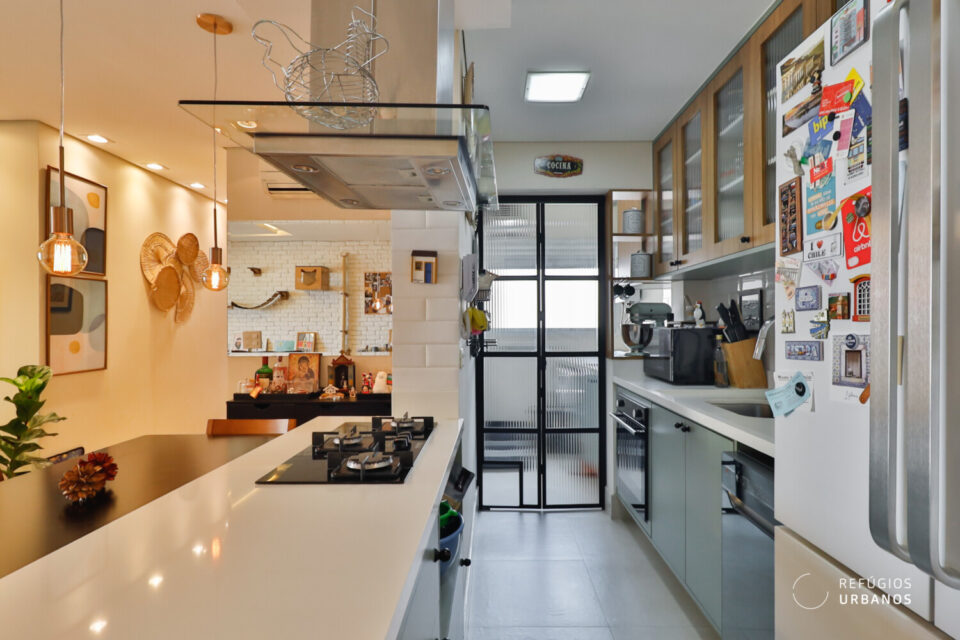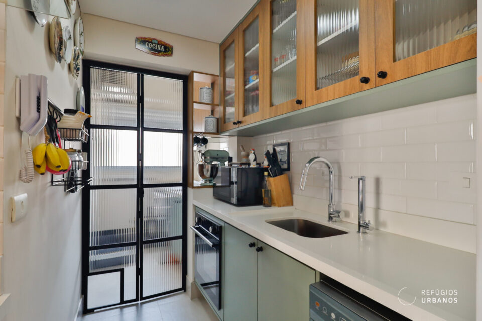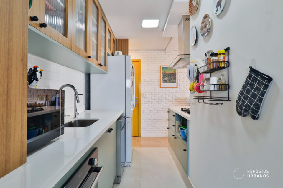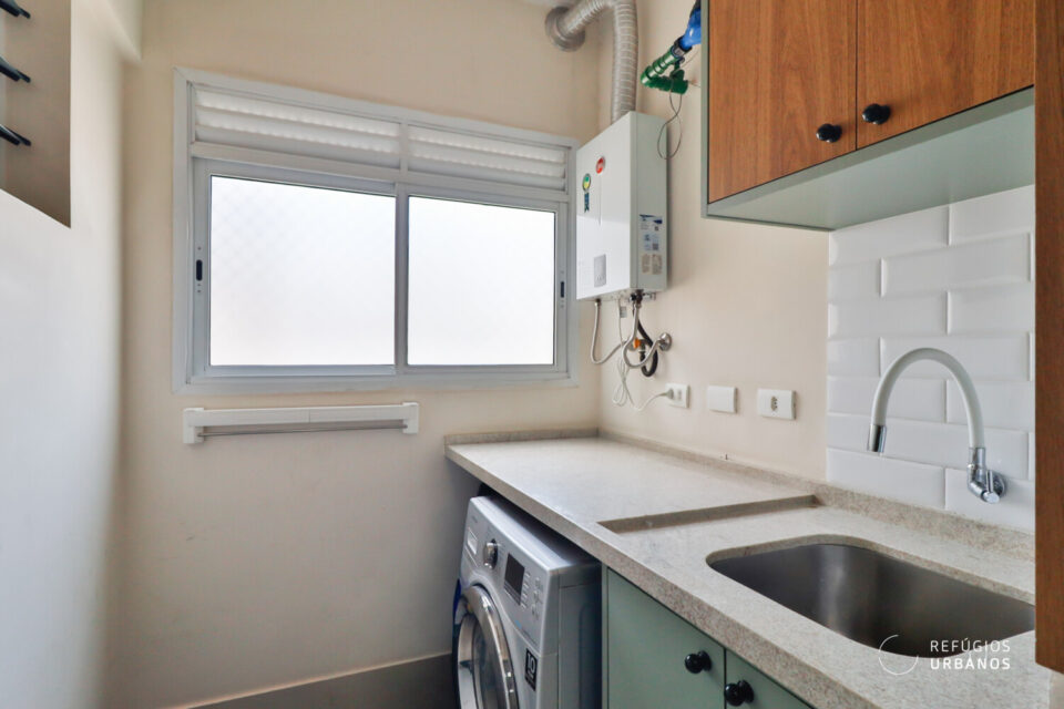 Voltando para a área interna do apartamento, mesmo com a integração, a cozinha não saiu perdendo em quantidade de armários. Assim, temos uma cozinha funcional e prática. A área de serviço, também com marcenaria funcional, é iluminada e arejada.