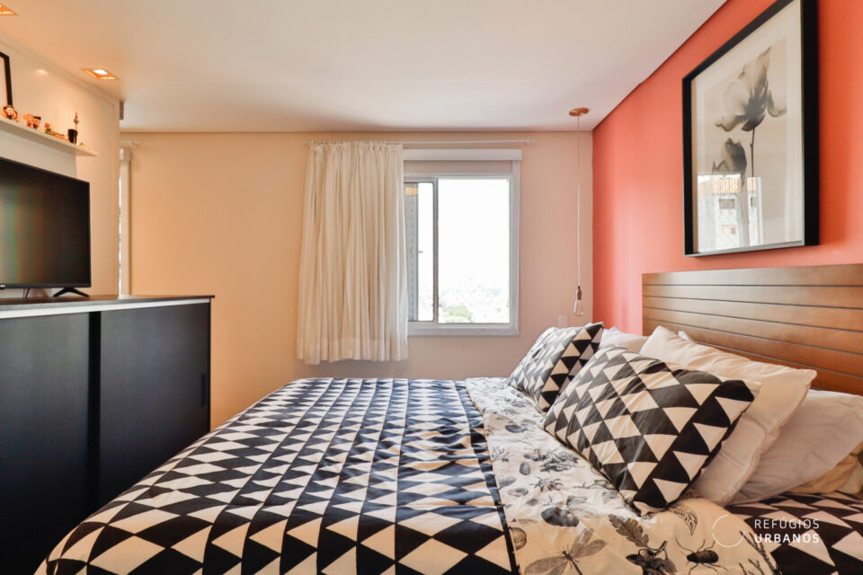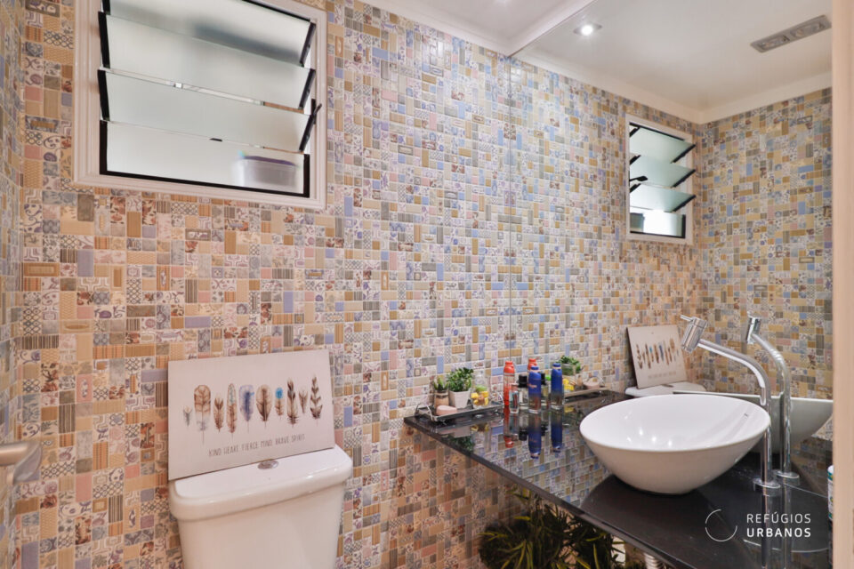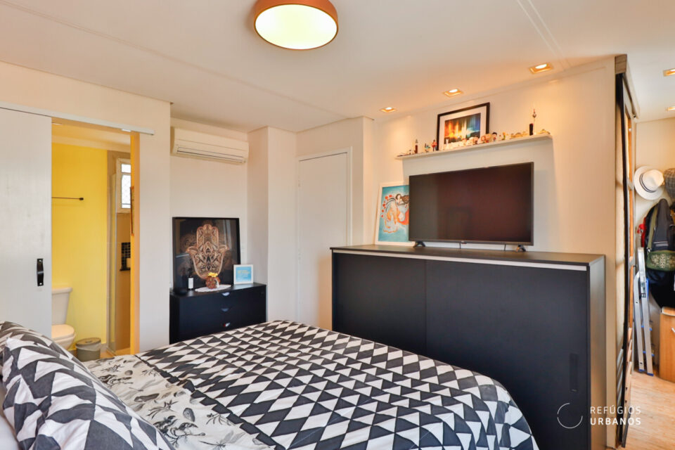 Na área íntima, encontramos uma suíte com tamanho acima da média, graças a reconfiguração no layout original. O banheiro social se tornou lavabo que atende as visitas.