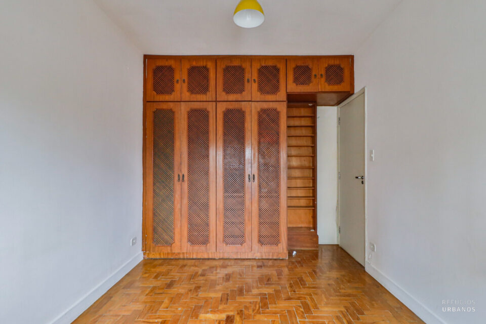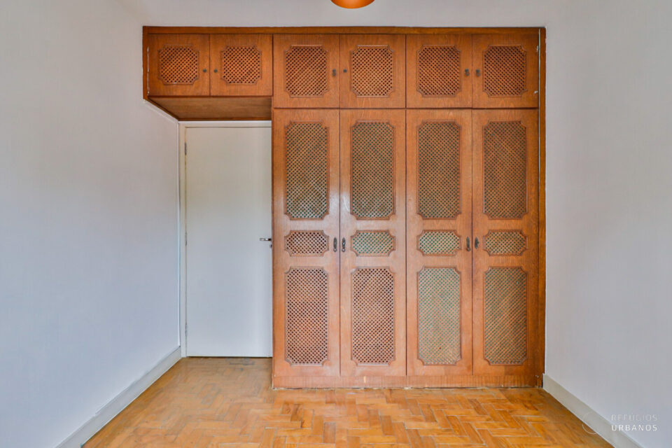 Aqui você pode entrar e morar, mas, se preferir, pode modernizar alguns ambientes para deixá-los com a sua identidade. Os dois dormitórios têm ótimas proporções e preservam os armários originais da época, cheios de personalidade.