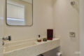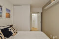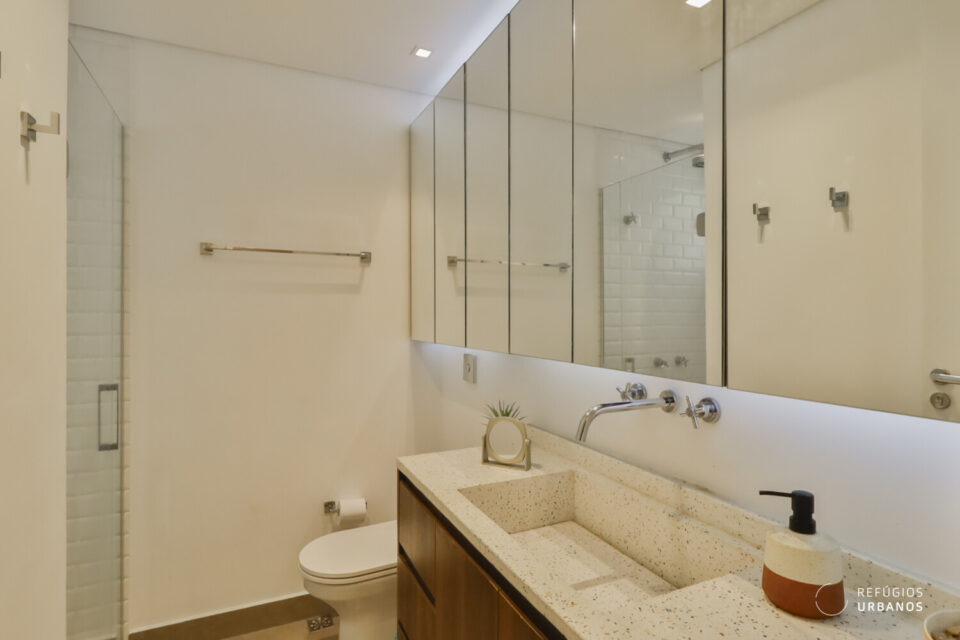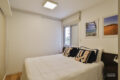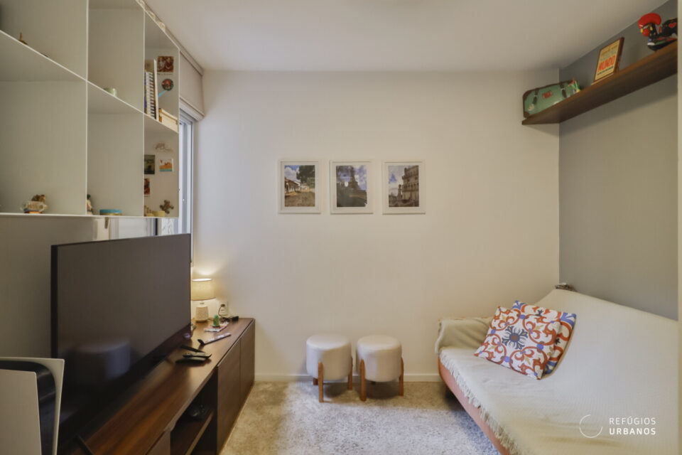 Temos um banheiro localizado estrategicamente ao lado dos dois quartos. Os espaços são arejados e com excelente iluminação natural. O quarto principal acomoda uma cama queen (mas comporta uma  de tamanho king), com mesinhas de cabeceira. Há armários de ambos os lados da cama. O outro quarto, por sua vez, atualmente é utilizado como sala de TV.