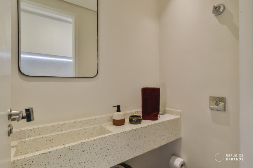 Ao lado da cozinha, fica a área de serviço, seguindo o mesmo padrão, já que os ambientes conversam entre si. Em frente, um banheiro, atualmente utilizado como lavabo.