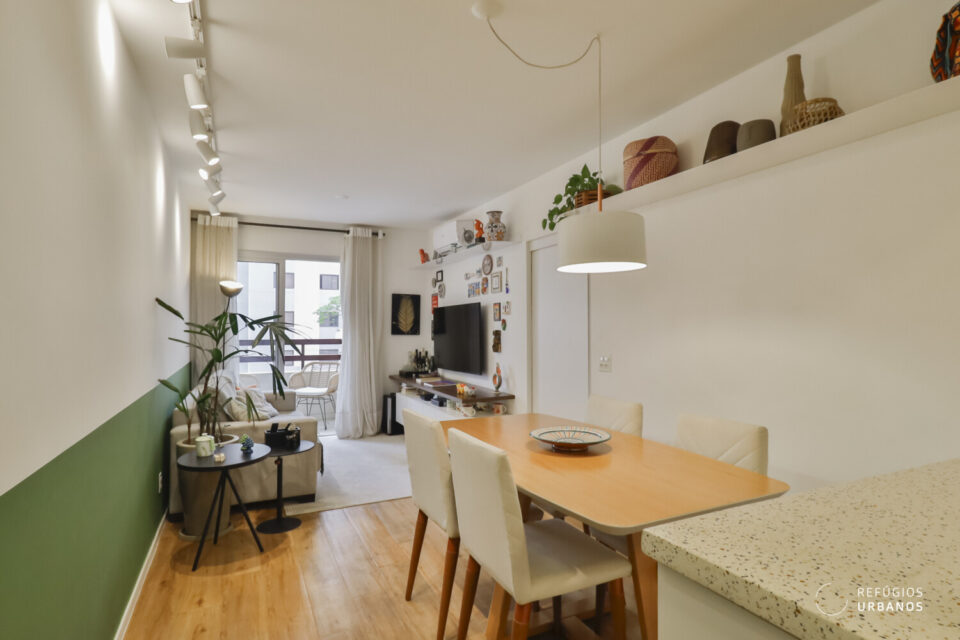 A sala de jantar está conectada à cozinha por meio de um balcão, ideal para refeições rápidas do dia a dia e para apoio. E, para quem gosta de cozinhar, a certeza de estar em um ambiente que vai servir de inspiração. Em outras palavras, tudo flui na área social.