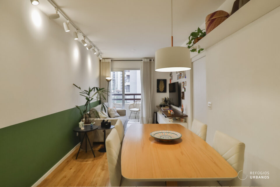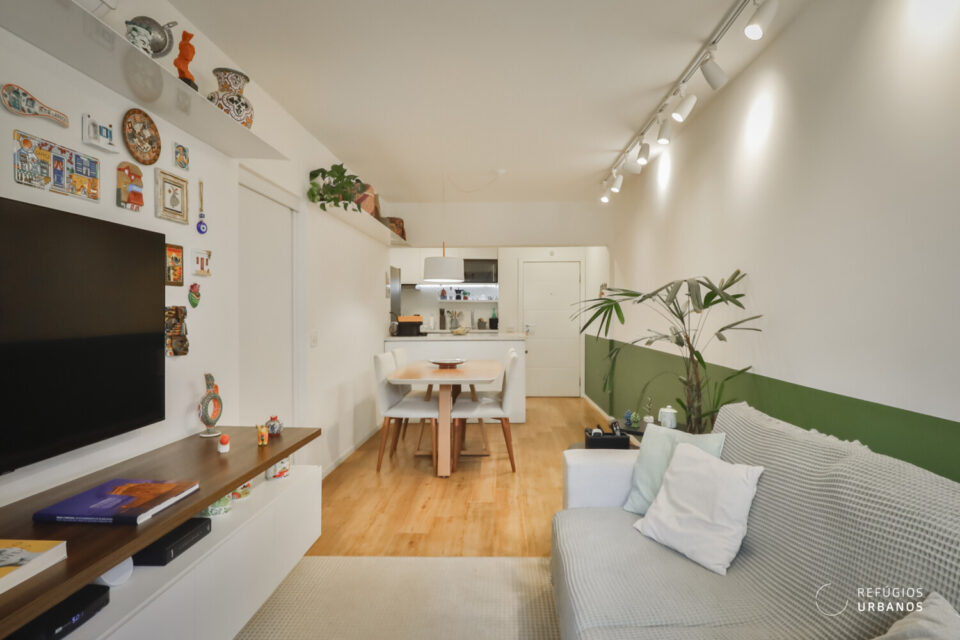 Primeiramente, ao entrar, a sensação é de aconchego e conforto, pois o apartamento é charmoso, ventilado e claro. Aqui temos espaços integrados e iluminados.