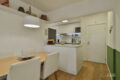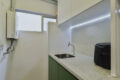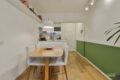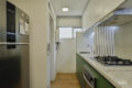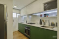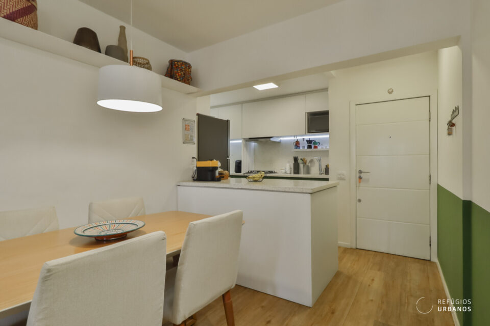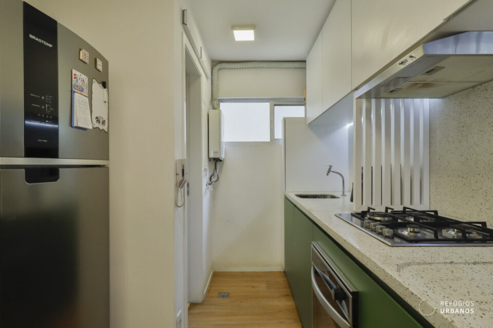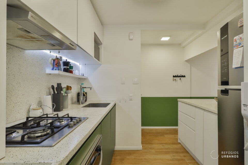 A cozinha fica à direita da entrada e chama a atenção: a bancada de granilite e marcenaria verde-oliva dão o toque especial ao espaço.