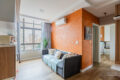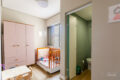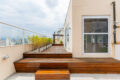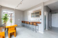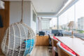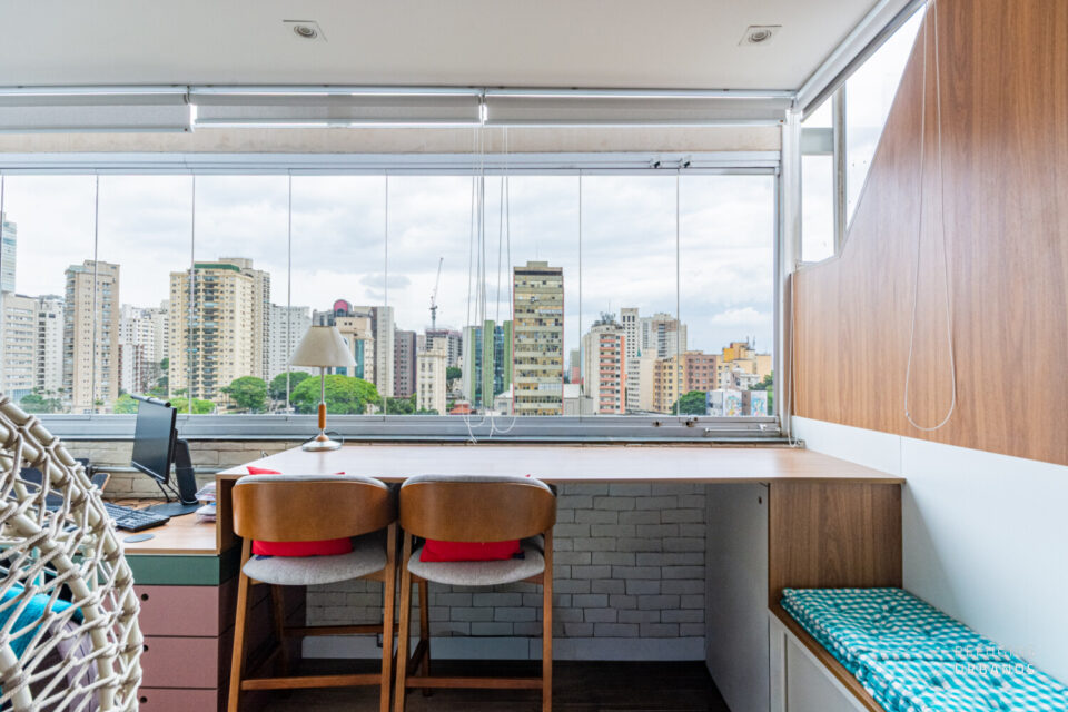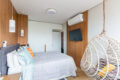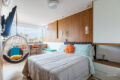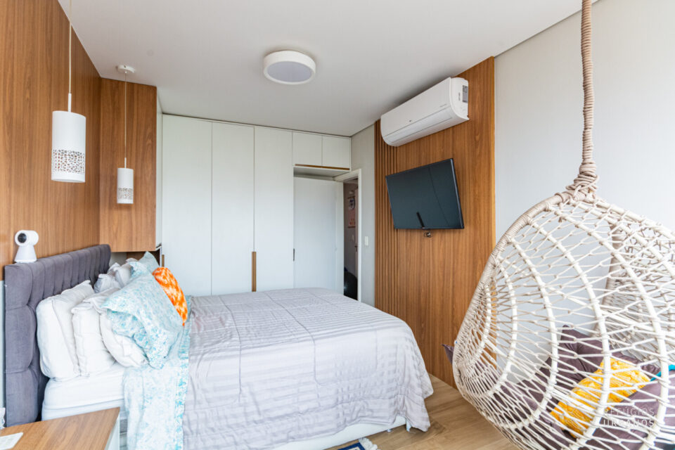 Uma bancada alta proporciona conforto enquanto se toma um café ou lê-se um livro. Falando em leitura, aqui também temos um balanço suspenso que proporciona ainda charme ao ambiente. Além disso, trata-se de um quarto com um bom tamanho e com bastante marcenaria. E não pára por aí: o quarto já está com ar condicionado instalado.