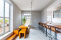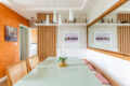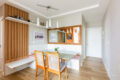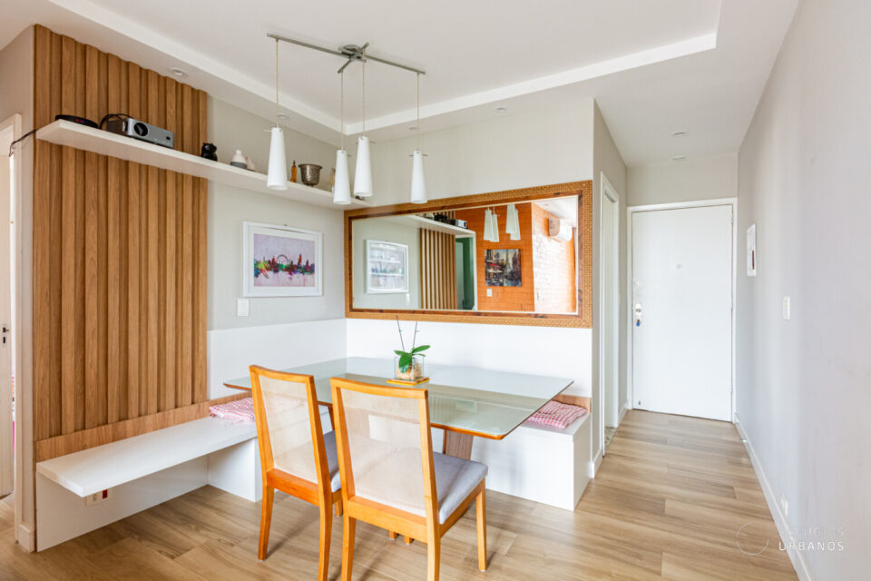 Logo na entrada, se percebe um sol gostoso que invade todo o ambiente da sala de jantar e estar, através do janelão quase piso-teto, com vista livre. A sala de jantar possui um canto alemão, proporcionando otimização de espaço e funcionalidade, uma vez que os assentos possuem baú.