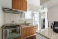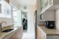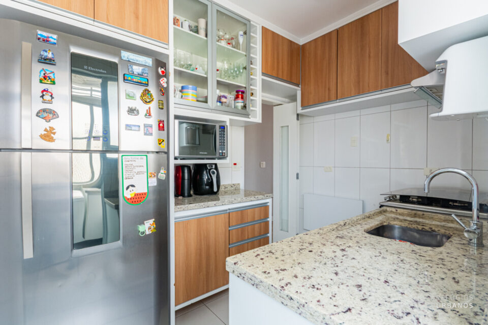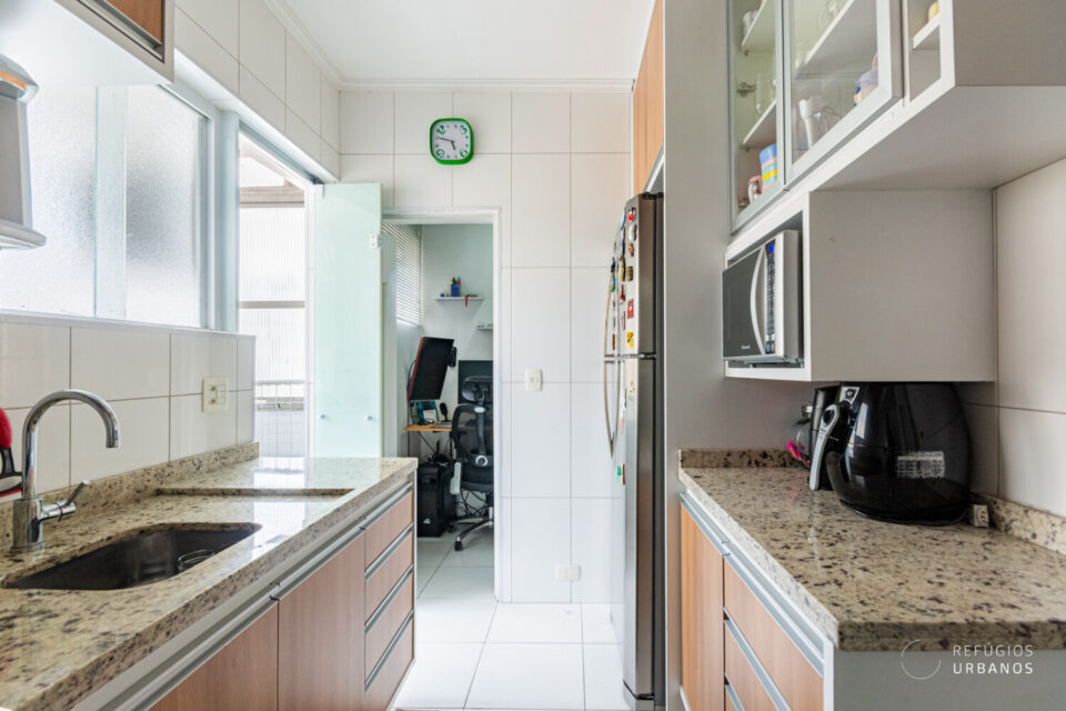 A cozinha é super prática. Além disso, vale destacar que está equipada com marcenaria sob medida. Há uma janela acima da pia, que garante ventilação natural, deixando o espaço ainda mais agradável. Logo ao lado, está a área de serviço, também equipada com marcenaria, uma bancada generosa e uma janela em forma de “L”, que proporciona excelente ventilação. Além disso, um sol da manhã generoso.