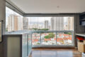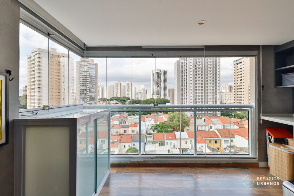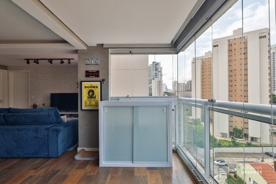 A varanda é integrada à sala, com muita iluminação e ventilação. As persianas controlam a incidência de luz e o fechamento em vidro oferece proteção de vento e chuva e outras intempéries.