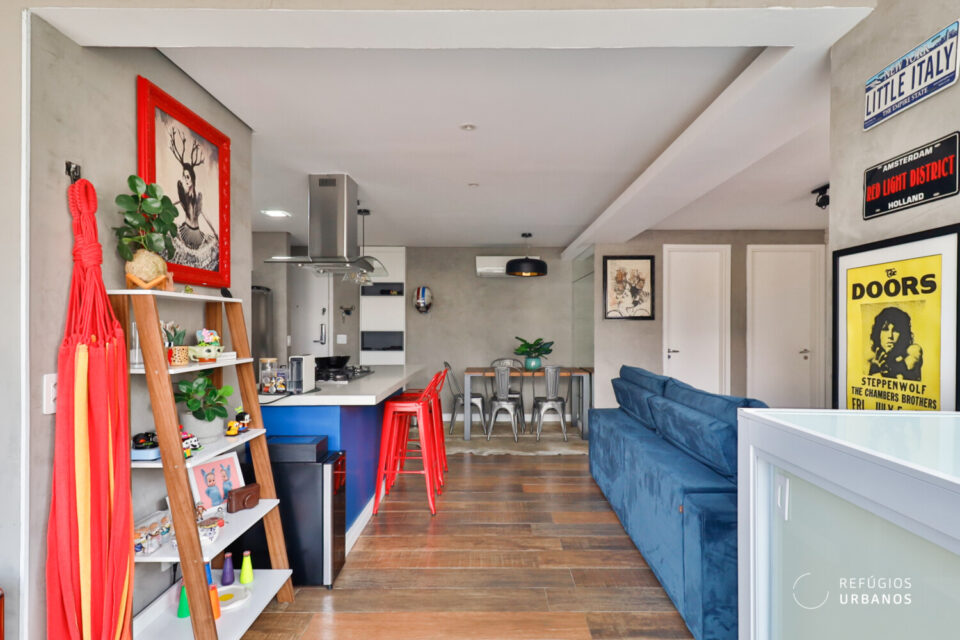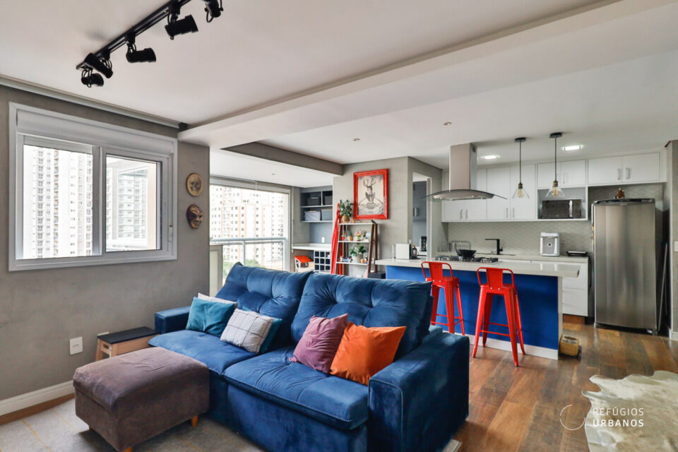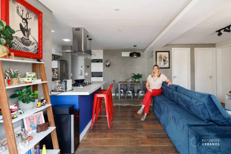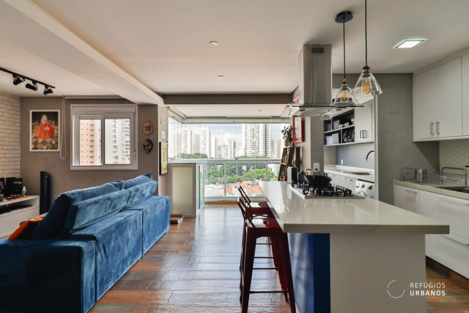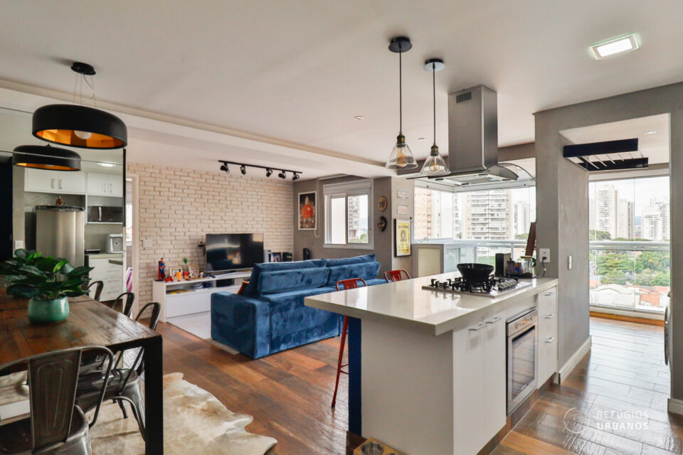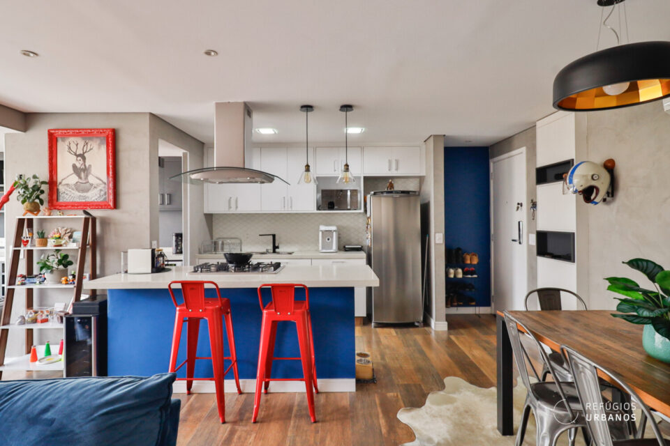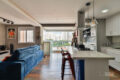 Dessa forma, logo ao entrarmos no imóvel, fica nítido o cuidado com cada detalhe. O projeto de reforma integrou a cozinha à sala com um toque contemporâneo, inteligente e cheio de estilo.