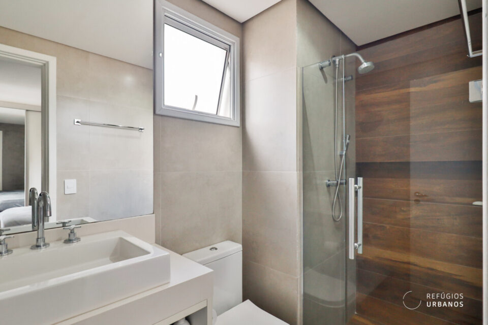 Os dois banheiros são completos, com marcenaria e chuveiro com aquecimento a gás.