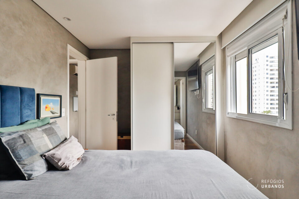 A suíte acomoda tranquilamente uma cama queen-size e conta com um ótimo guarda-roupa planejado, com espelho em uma das portas de correr.