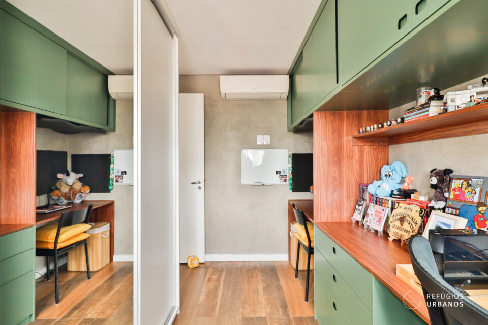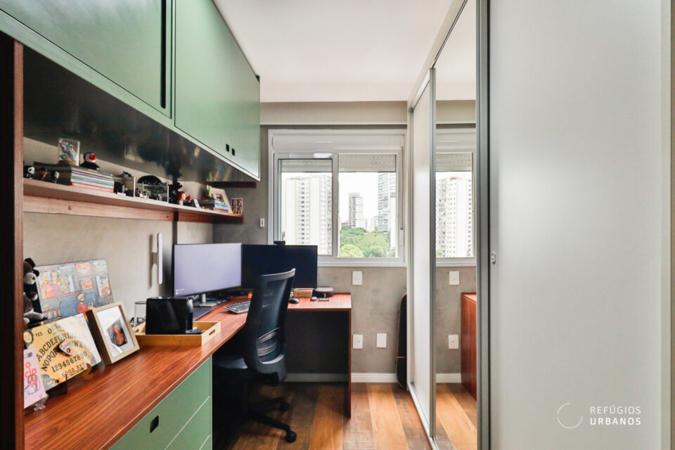 O segundo quarto tem muitos armários e, atualmente, tem uso como home-office. Se substituir a bancada de trabalho por uma cama, volta a funcionar como dormitório.