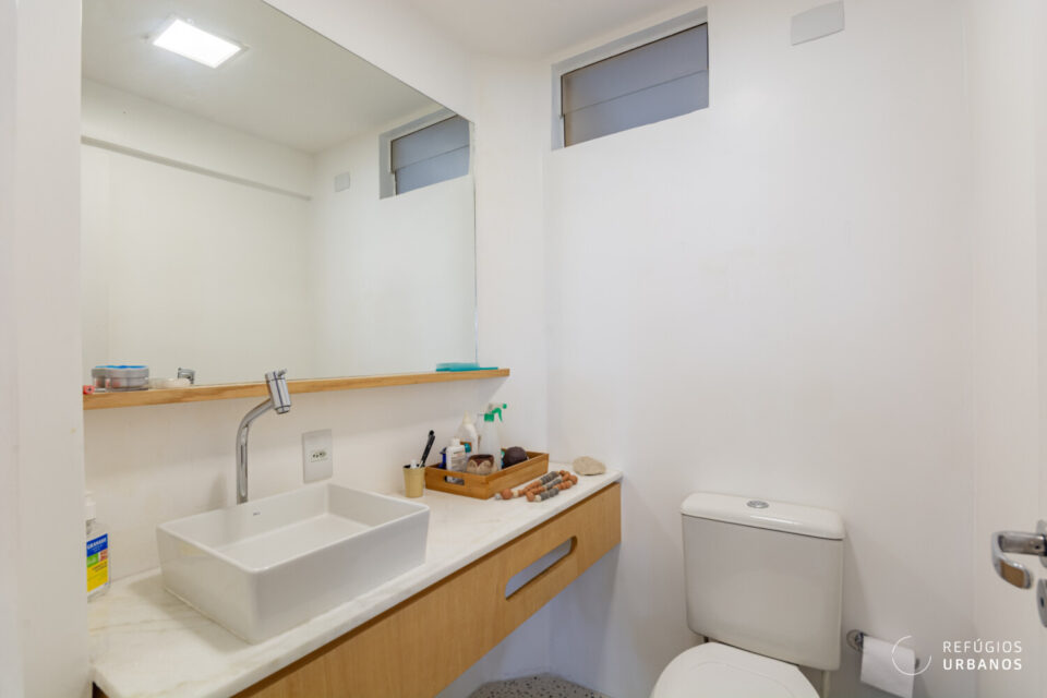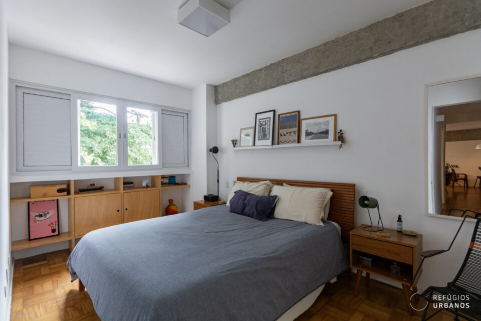 Na ala íntima, por um corredor, temos acesso aos dois dormitórios. Aqui temos o quarto principal com closet e um segundo dormitório com marcenaria. Além do mais, ambos os quartos com janelas grandes e vista verde. Ainda por aqui, um banheiro completo que serve os dois quartos.
