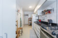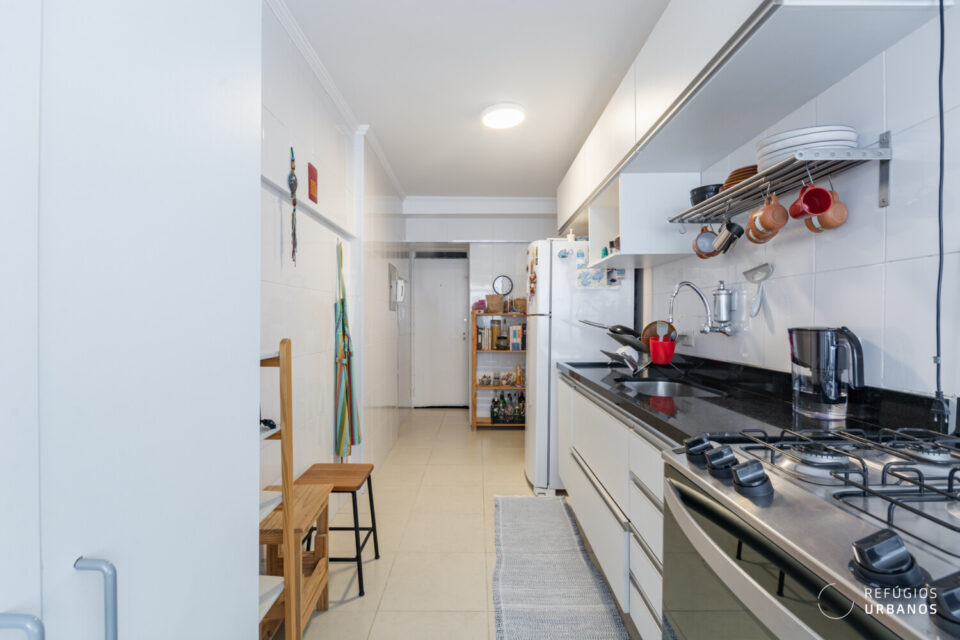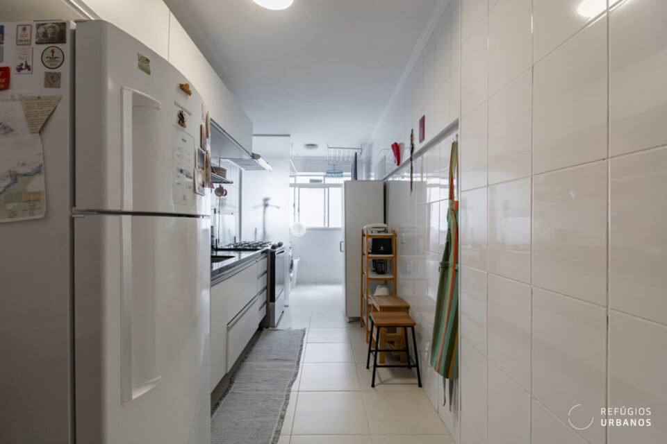 Do lado aposto das janelas, temos a cozinha de um bom tamanho, funcional e com bastante armários para armazenamento. Seguindo a diante, uma boa área de serviço com janelas grandes e, além disso, trás muita iluminação e ventilação pro ambiente.