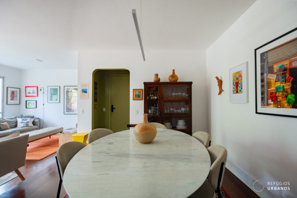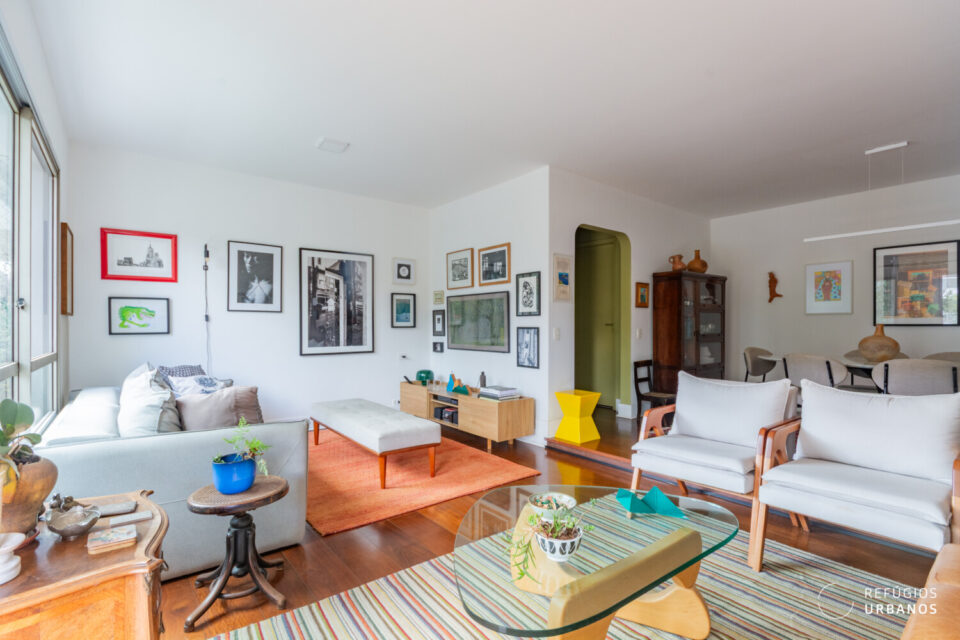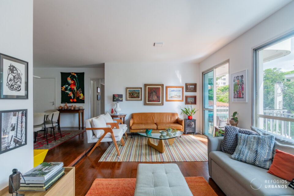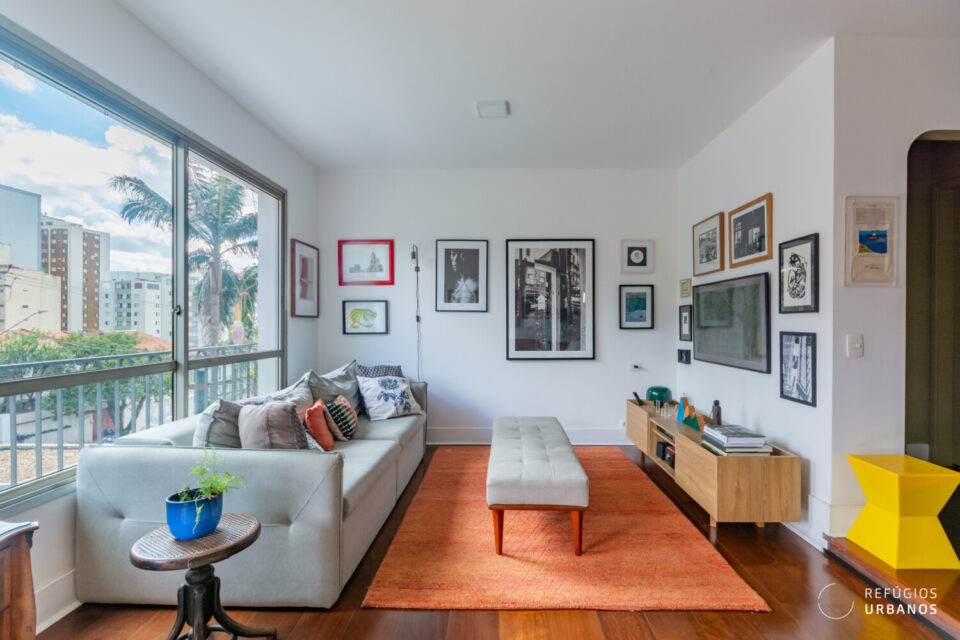 Sua sala é grande o suficiente para comportar 3 ambientes distintos, e conta com uma deliciosa varanda, com vista para a copa das árvores, acessada por uma generosa porta-balcão.