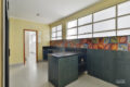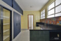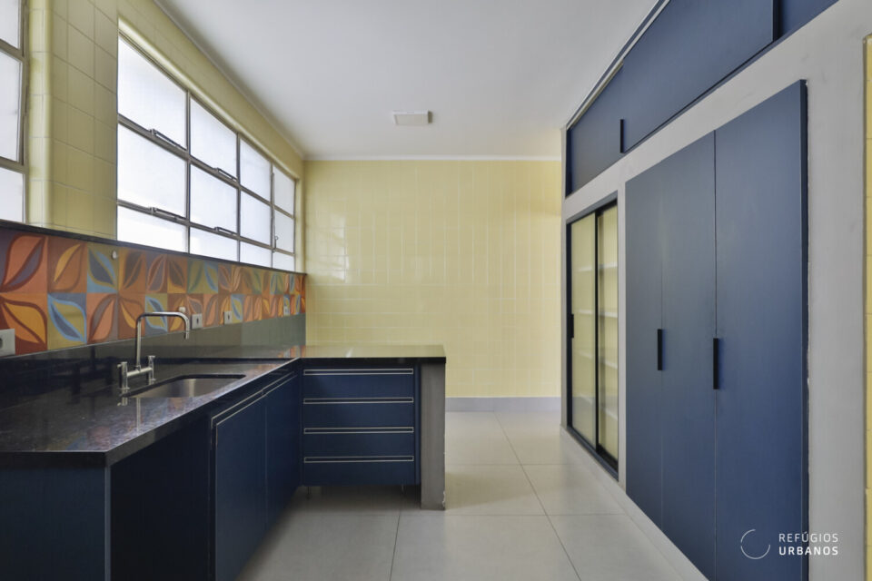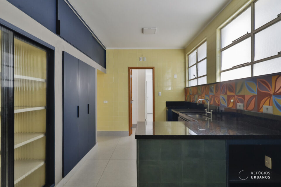 Seguindo adiante, chegamos na cozinha, e mais uma vez, a boa impressão simplesmente aflora. Assim como no living, ela é igualmente iluminada, revelando um espaço generoso onde cores vibrantes conversam entre si e criam uma atmosfera acolhedora. Além disso, a marcenaria bem executada e a charmosa porta de serralheria adicionam personalidade, enquanto o azulejo hidráulico completa o conjunto com toque artesanal.