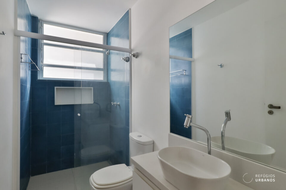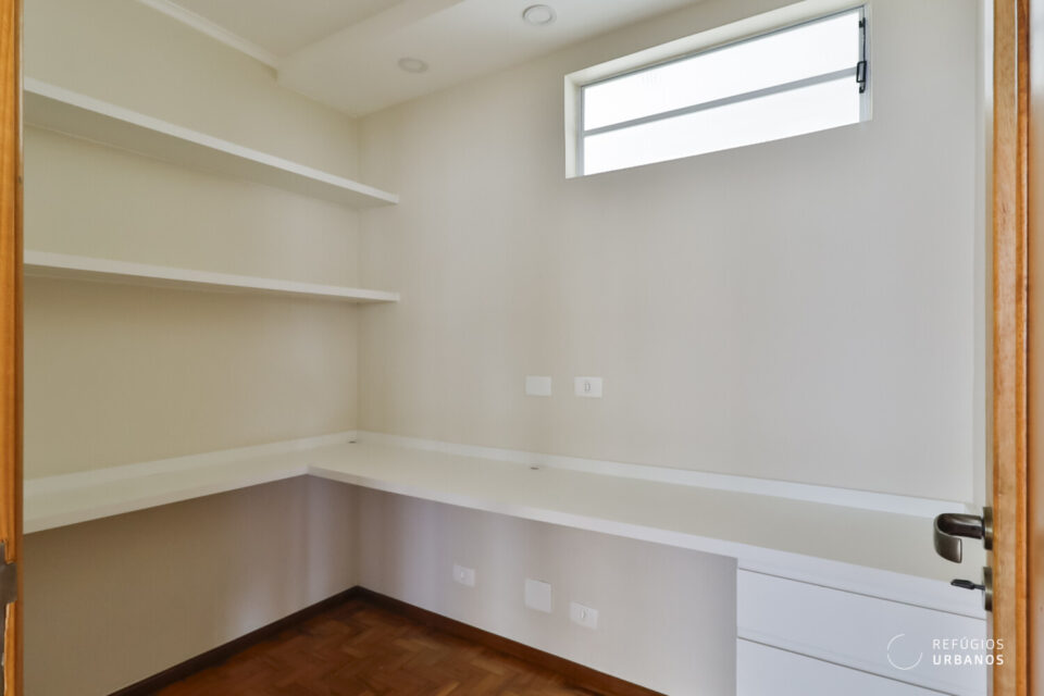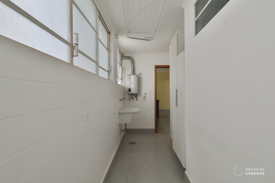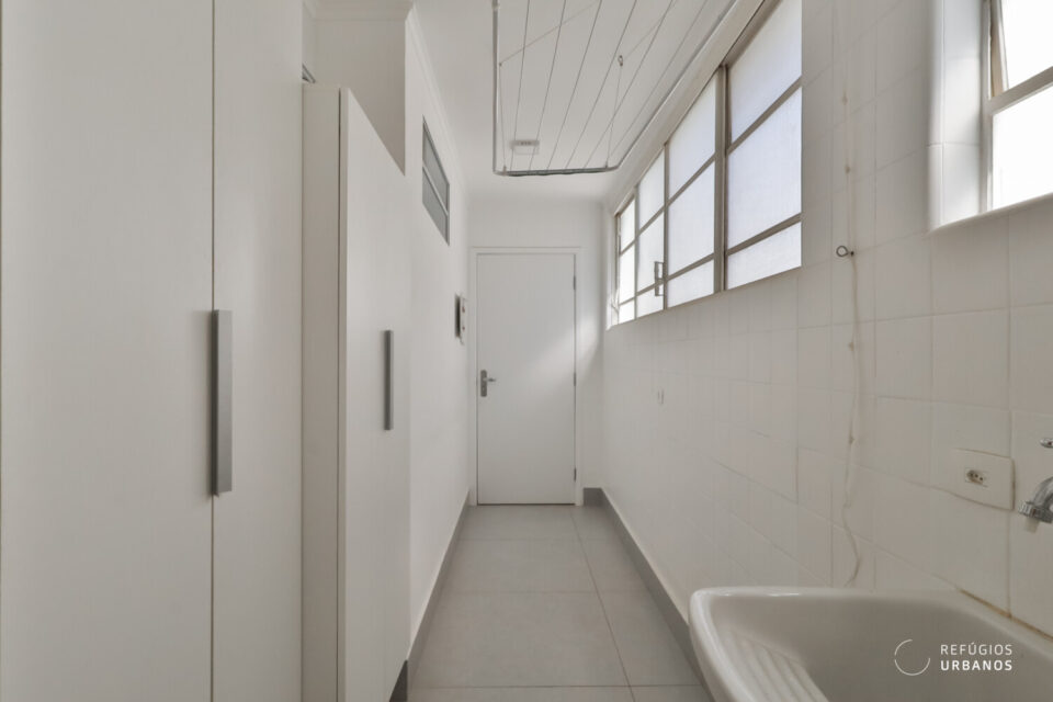 A lavandeira, segue o mesmo estilo: iluminada, funcional e com boa marcenaria.