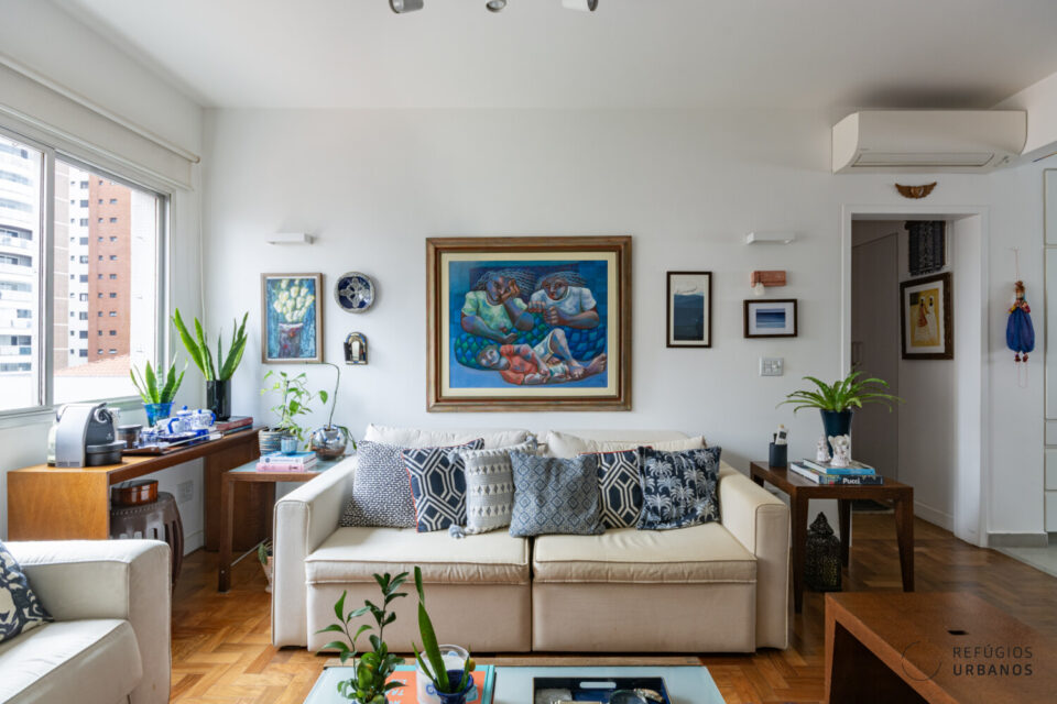 A sala é grande o bastante para dois ambientes, tem o piso em tacos de madeira e é clara e arejada, com ar condicionado instalado.