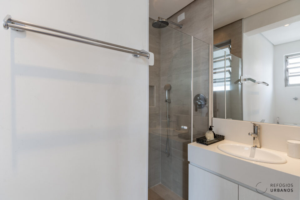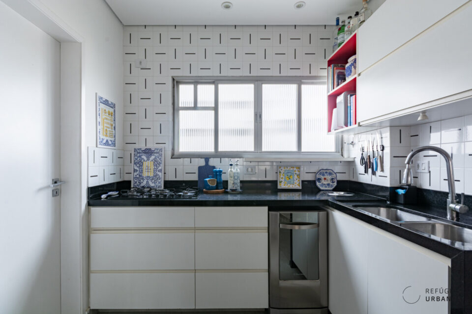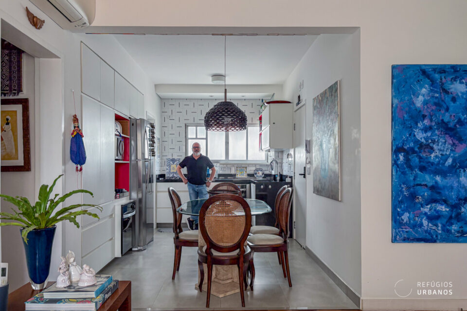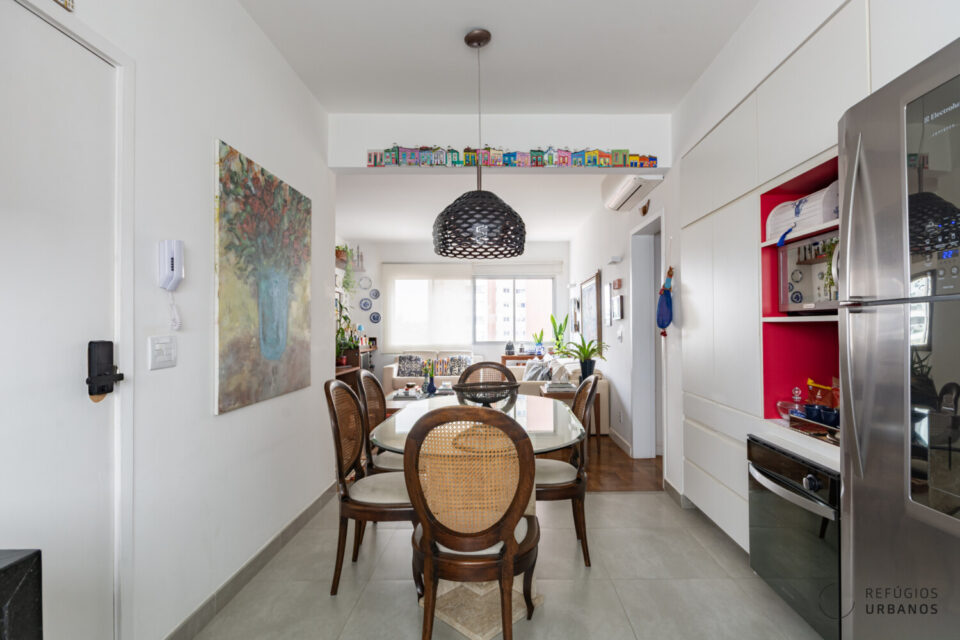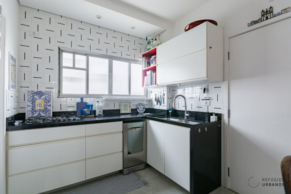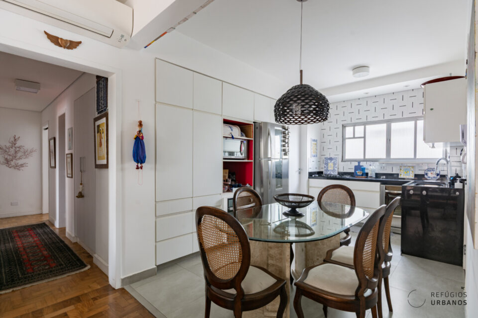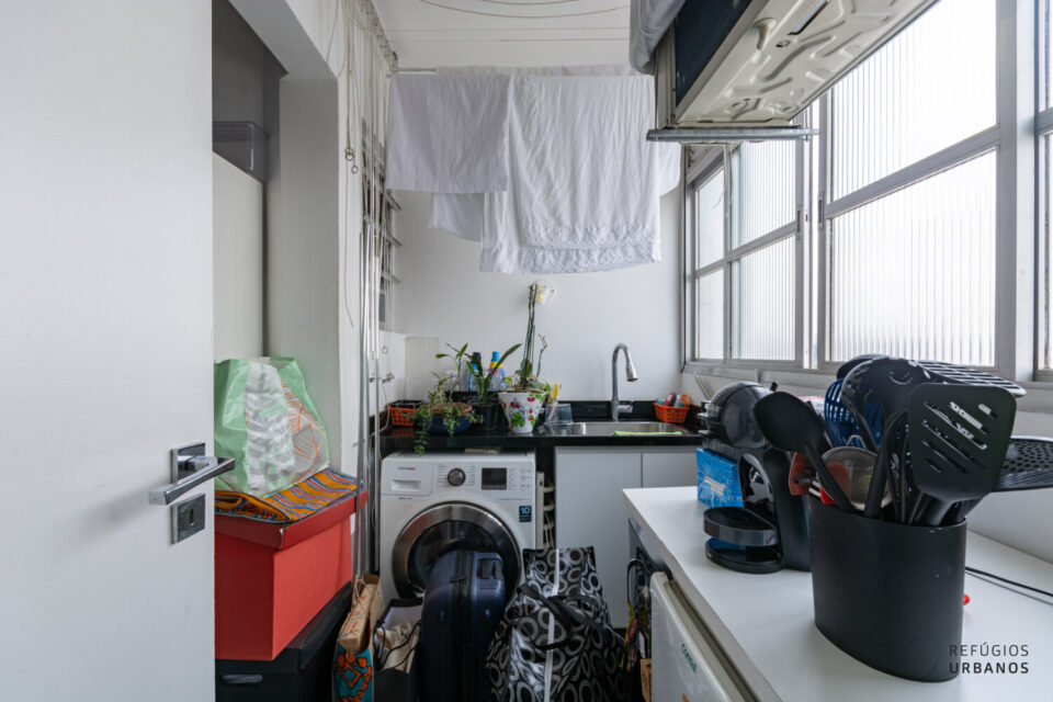 A cozinha, bem servida de marcenaria, foi integrada ao corpo da sala, formando um contínuo funcional e ao mesmo tempo aconchegante. E é seguida por uma boa área de serviços.