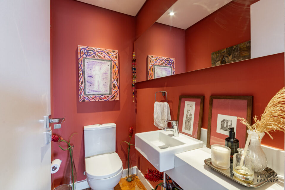 Indo na direção dos quartos, no corredor, temos um belo lavabo, com um lindo piso em tacos de madeira.