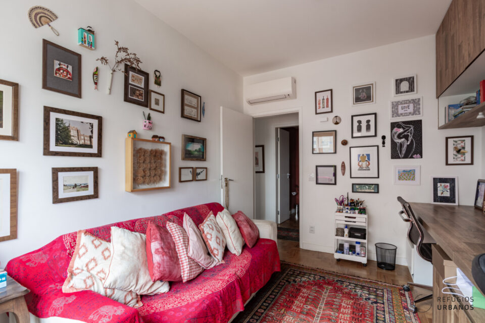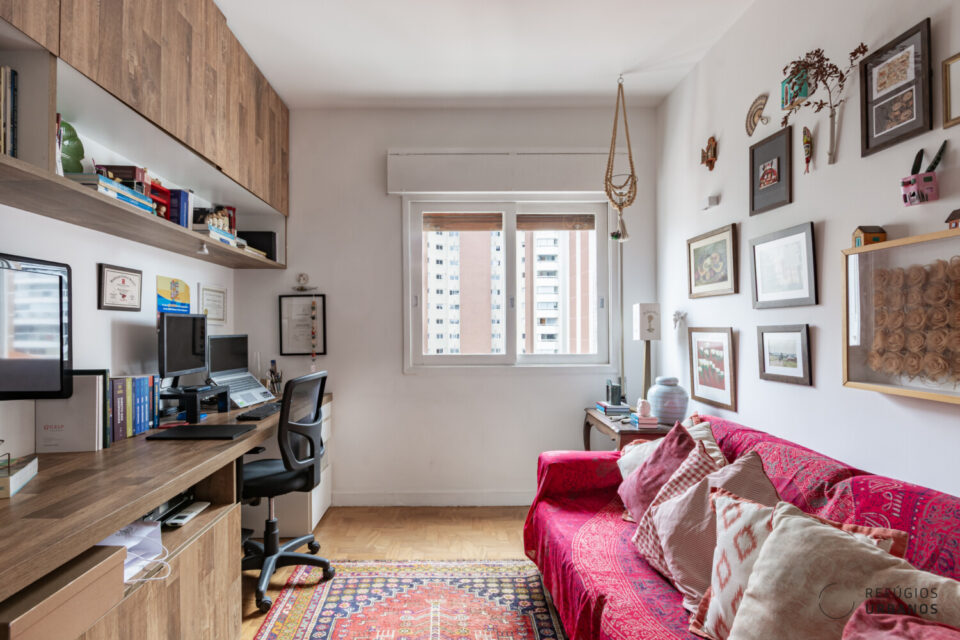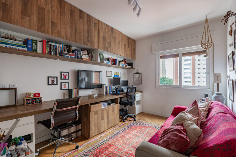 Na parte íntima, são duas suítes e mais um quarto, hoje adaptado e utilizado como escritório, com bancada e marcenaria de ótima procedência. Todos com ar condicionado.