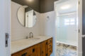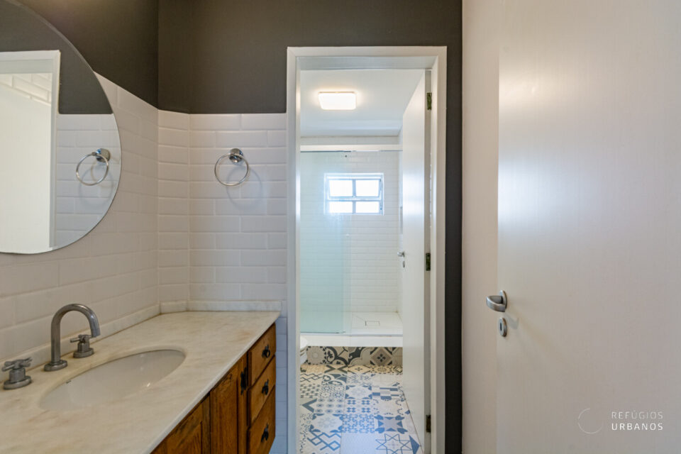 Um pouco antes de chegar nos quartos, temos um banheiro amplo que atende os dois dormitórios. Para quem gosta de suíte, seria possível transformar esse banheiro em dois.