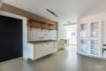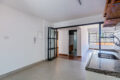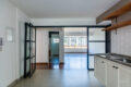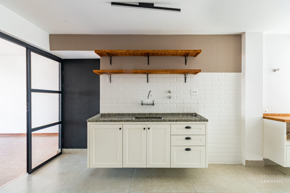 A cozinha, integrada com a sala, possui uma porta de serralheria muito bacana, trazendo um ar descolado para o apartamento. Temos aqui amplitude, com a marcenaria já embutida e muito espaço para armazenamento.