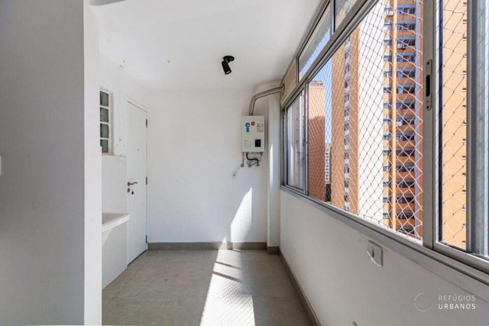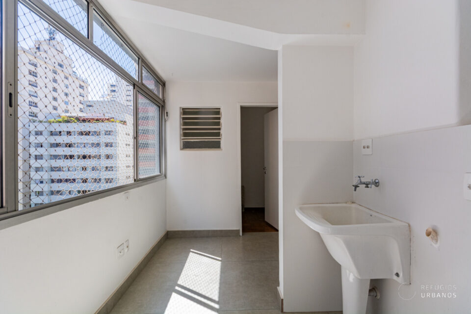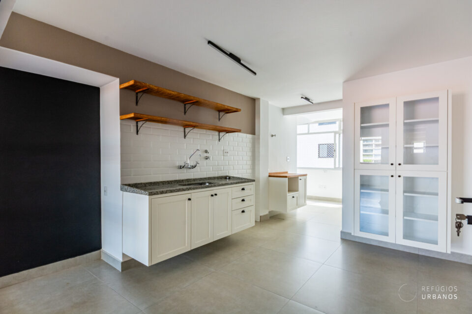 A lavanderia é também bem espaçosa e conta ainda com uma janela ampla que traz muita iluminação natural para a cozinha. Aqui, ainda temos um quarto de serviço e um banheiro de apoio.