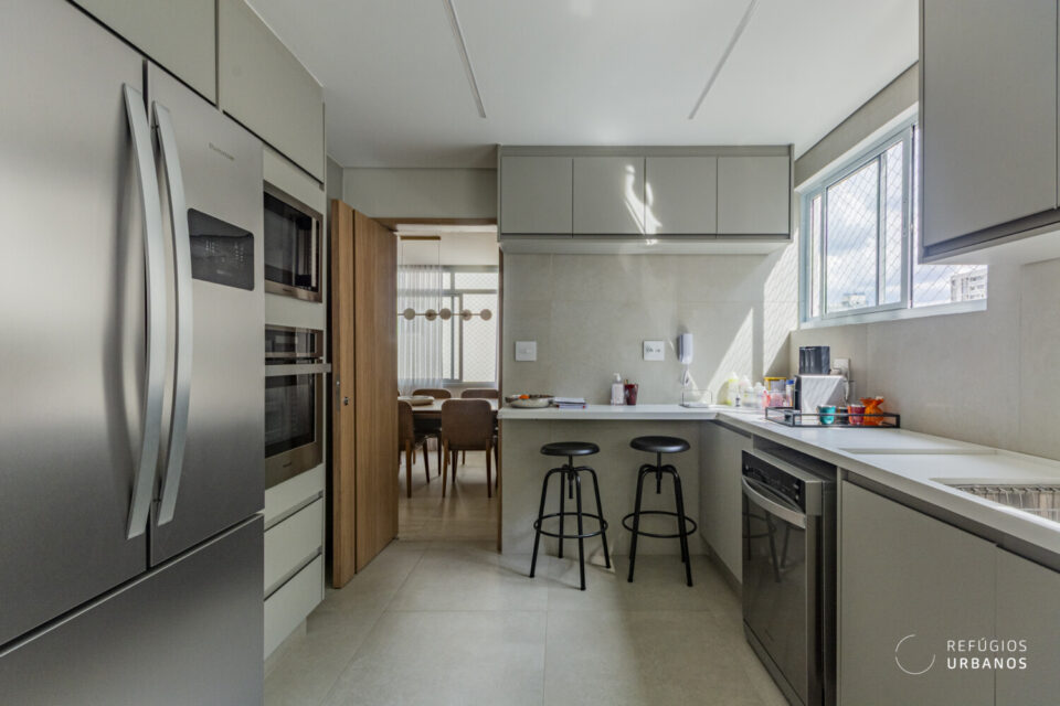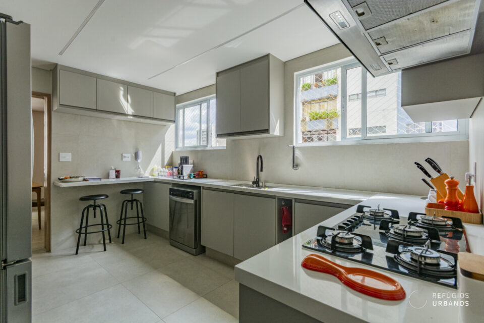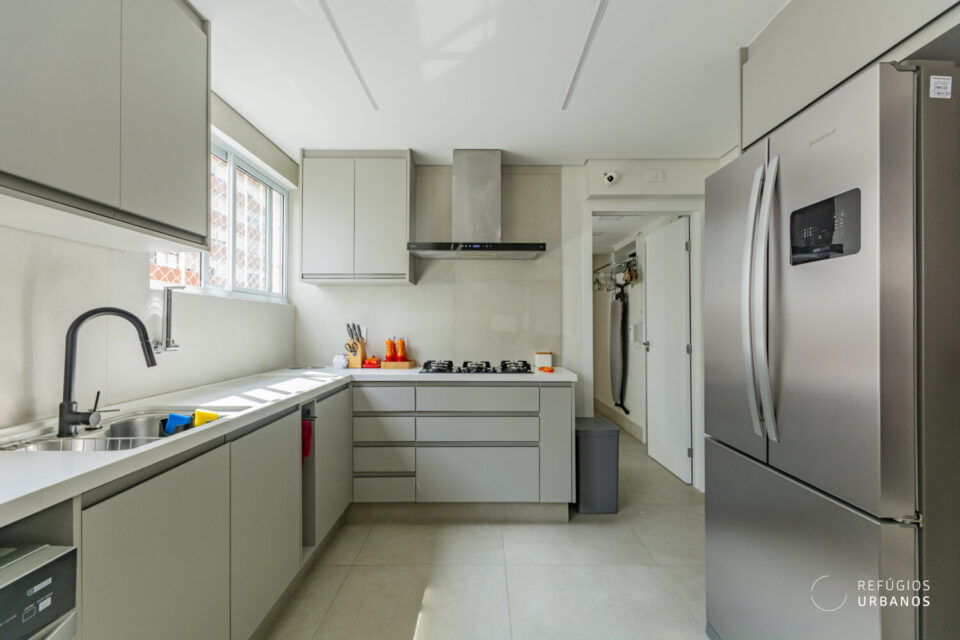 No que diz respeito à área de serviço, a cozinha é repleta de marcenaria planejada e está equipada com eletrodomésticos de última geração. Além disso, a lavanderia é ampla, bem ventilada e conta com banheiro e quarto, atualmente adaptado como home office, agregando ainda mais versatilidade ao espaço.