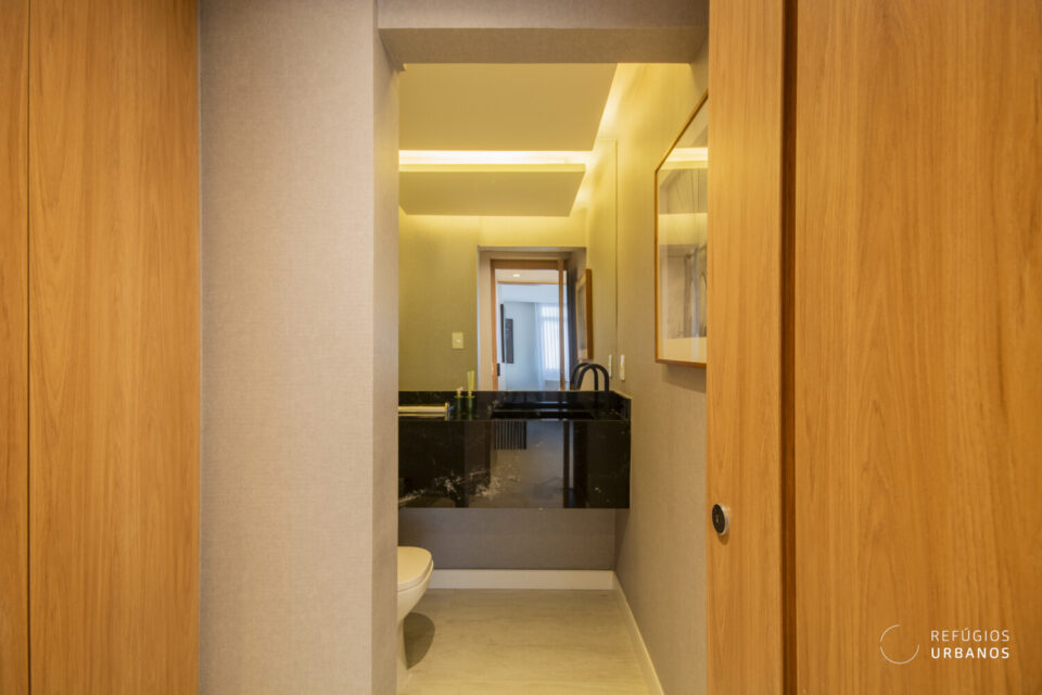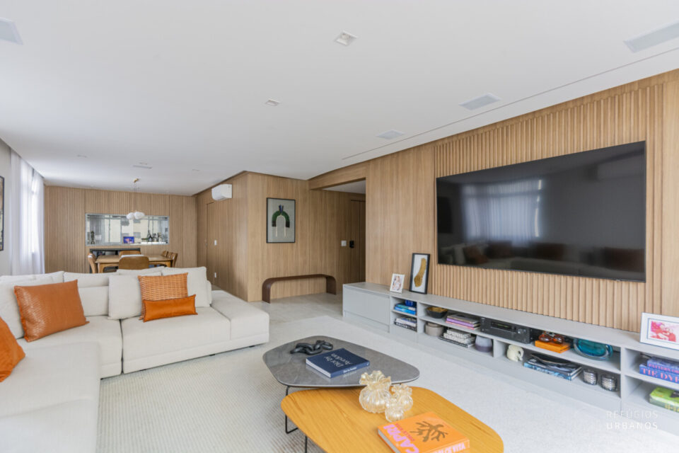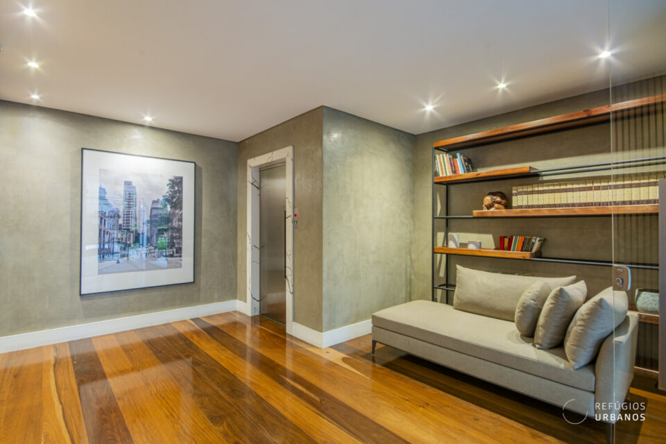 Logo na entrada, o hall social privativo reforça a exclusividade do imóvel. Em seguida, a ampla sala com grandes janelões proporciona espaços claros, bem ventilados e ideais para receber com conforto e elegância.