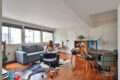 Primeiramente, os ambientes são integrados. A sala tem piso de tacos e espaço para dois ambientes confortáveis e um cantinho perfeito para home office.