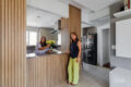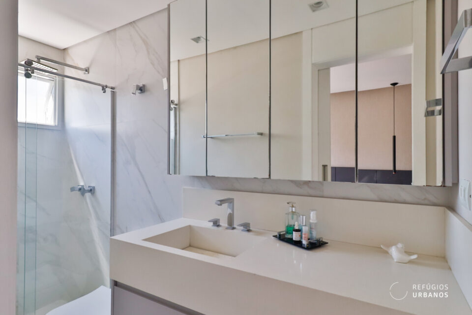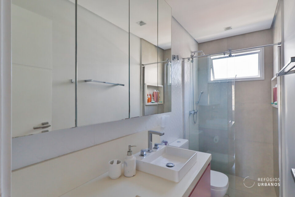 O banheiro que atende esses dois dormitórios conta com ventilação natural e marcenaria em tom diferenciado, adicionando personalidade ao ambiente.