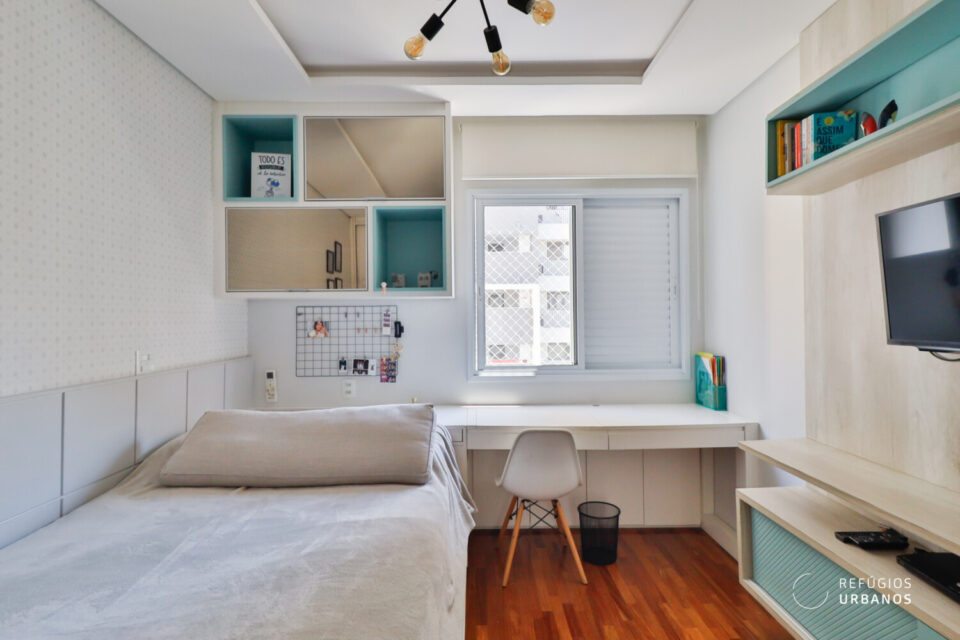 O segundo dormitório recebe o sol da tarde e também conta com armários planejados. Em ambos, o ar-condicionado Fujitsu quente e frio foi instalado durante a reforma de 2021.