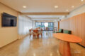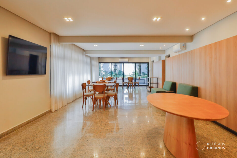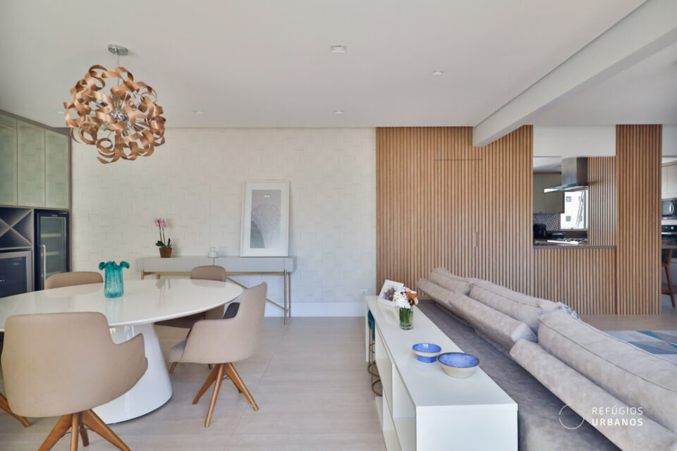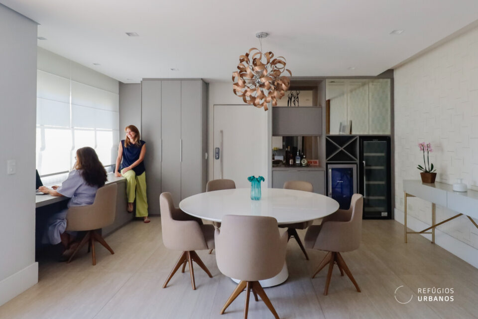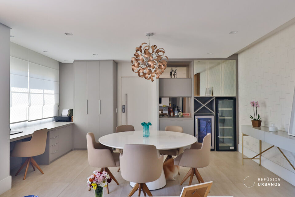 A sala é distribuída em dois ambientes amplos, estar e jantar. Além disso, um canto para um office debaixo de uma das janelas, com vista e sol, enquanto outro canto abriga um bar, tudo em harmonia criando uma atmosfera sofisticada para o dia a dia e perfeito para quem gosta de receber.