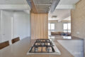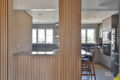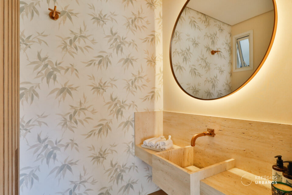 Lavabo lindamente decorado com ventilação natural, seu acesso é pela marcenaria ripada da parede, que trouxe mais aconchego à sala.