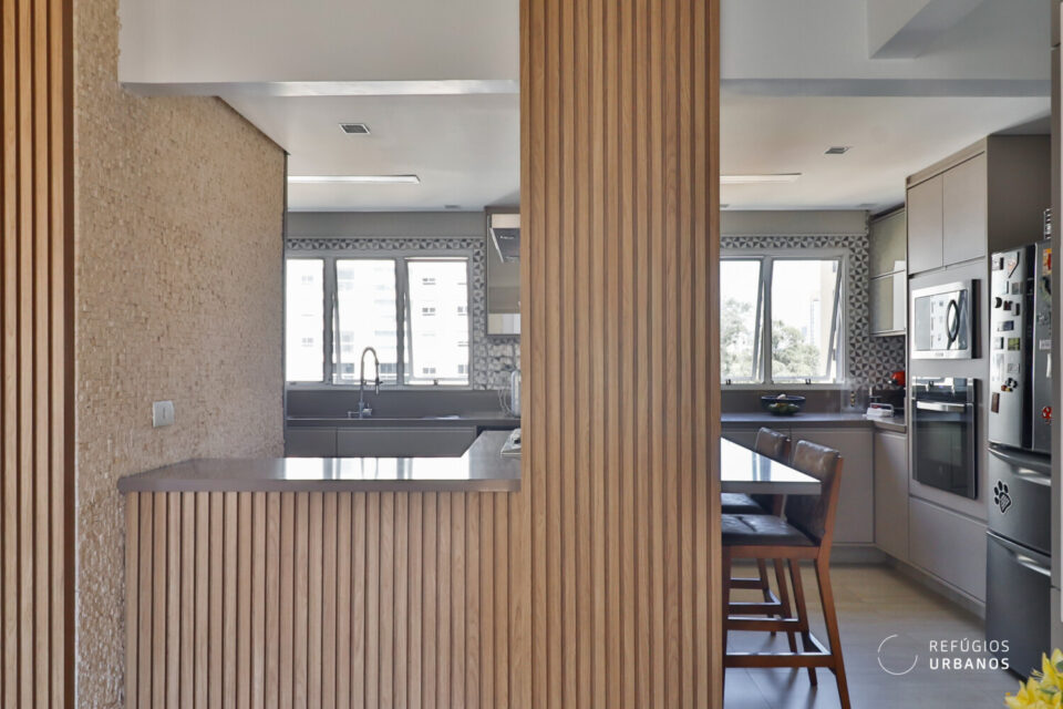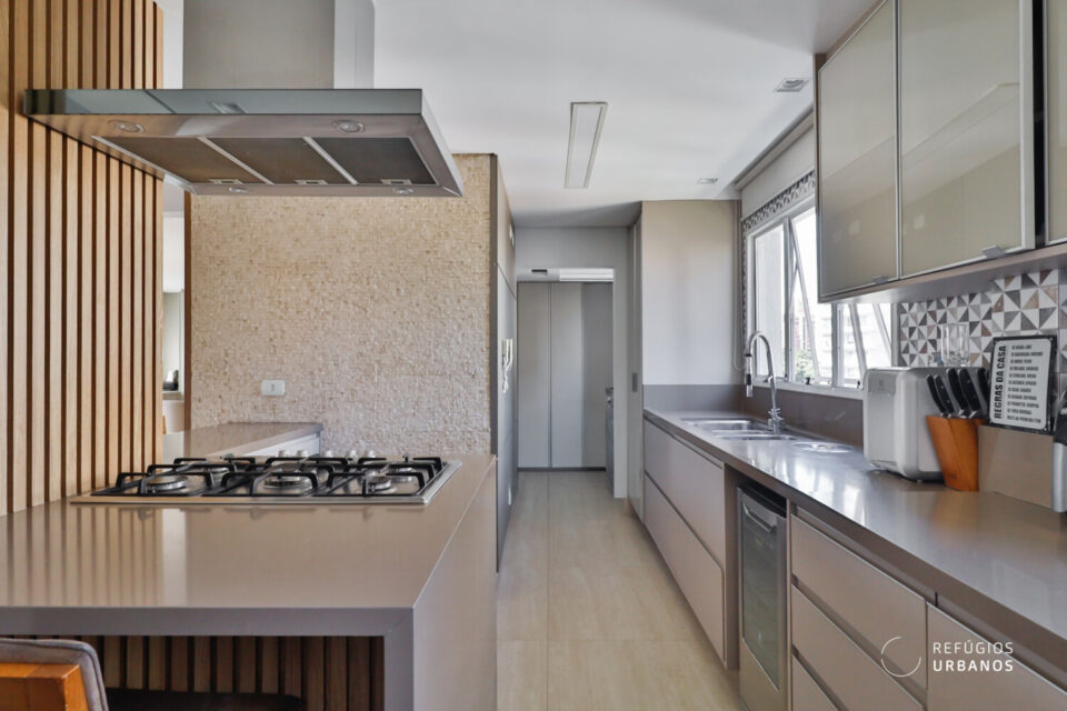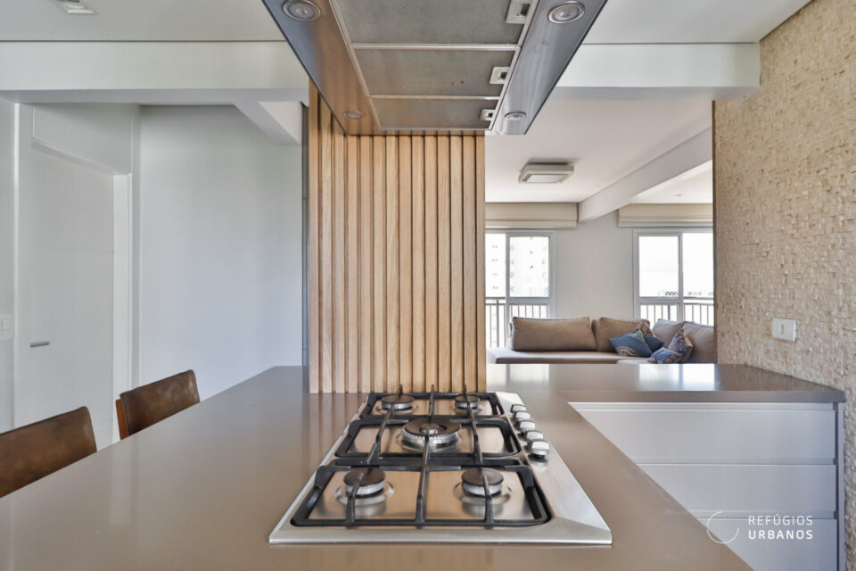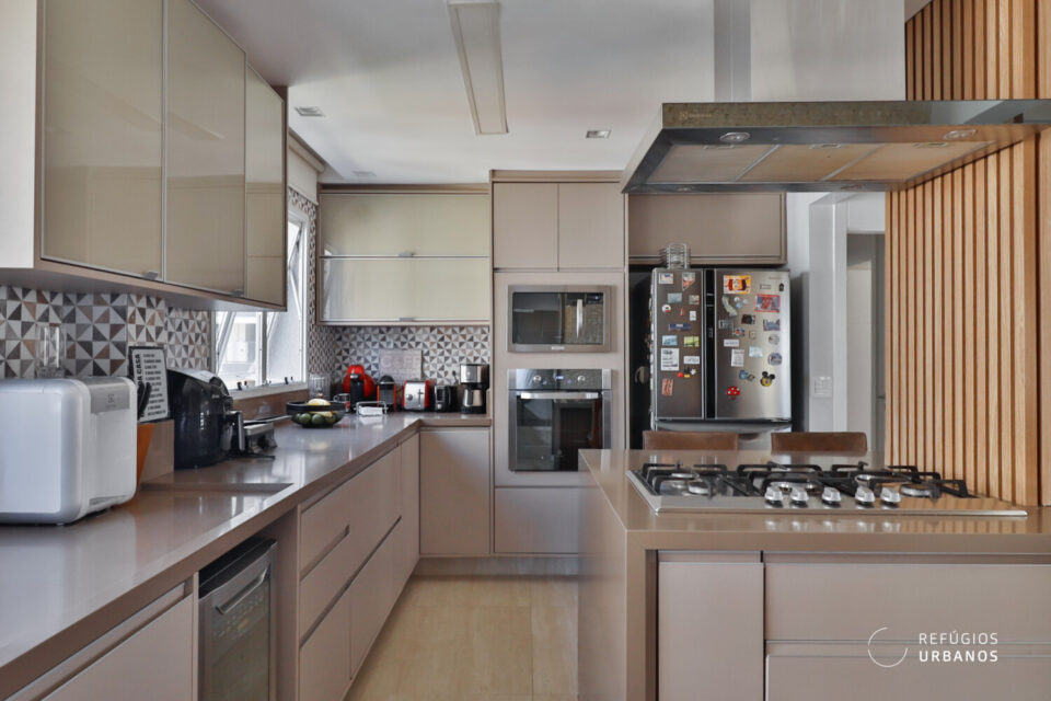 A cozinha é incrível, semi integrada e foi projetada e pensada para quem valoriza conforto e estética. Equipada com cooktop a gás, coifa e torre quente com acabamento em quartzo na cor cappuccino contrastando em perfeita harmonia com a marcenaria.