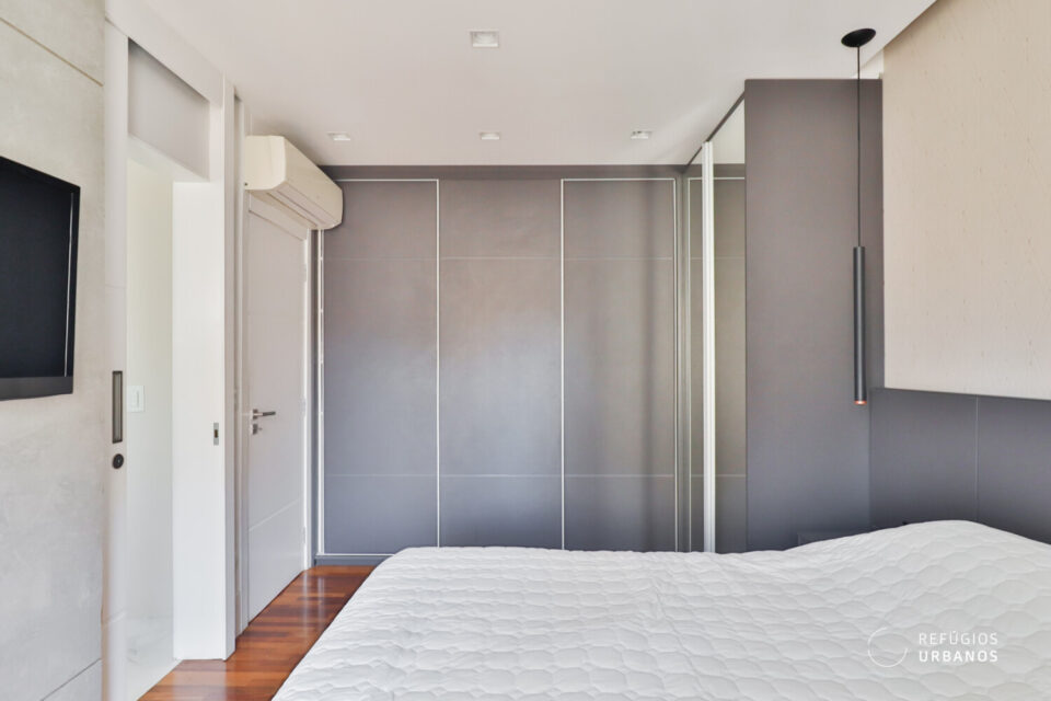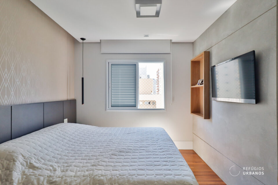 A suíte foi concebida para receber cama king com conforto, com espaço para mesinhas laterais. Seu banheiro é equipado com ventilação natural e bancada em quartzo branco.