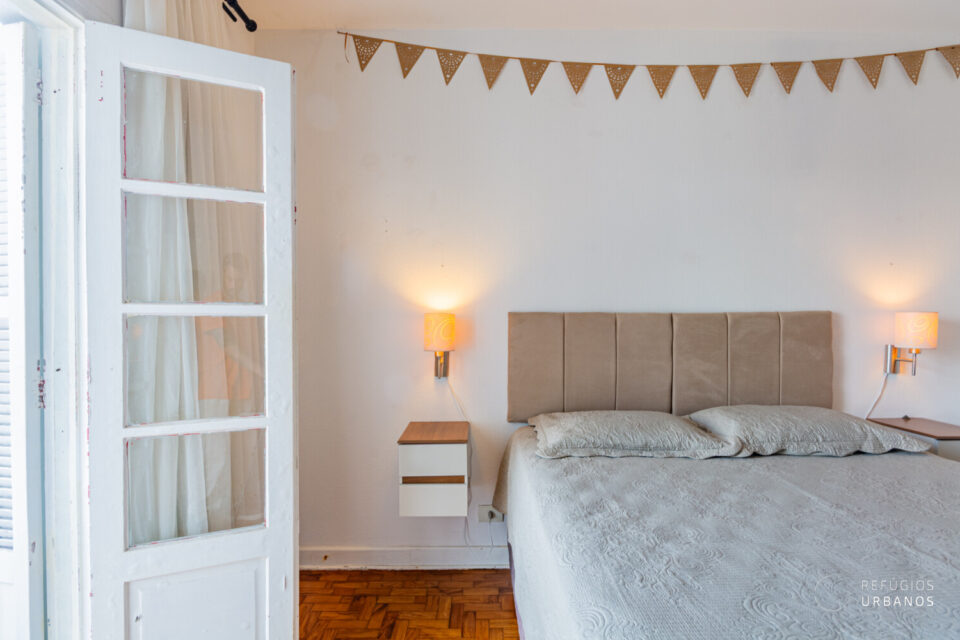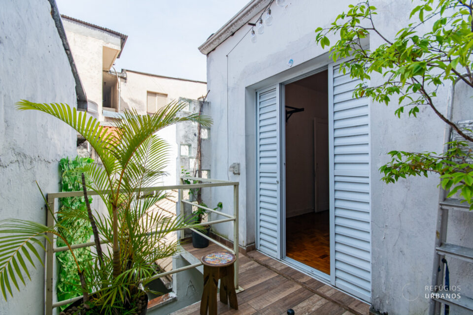 No andar superior, o quarto principal tem uma varandinha charmosa, perfeita para estender a rede e curtir o sossego da vizinhança.