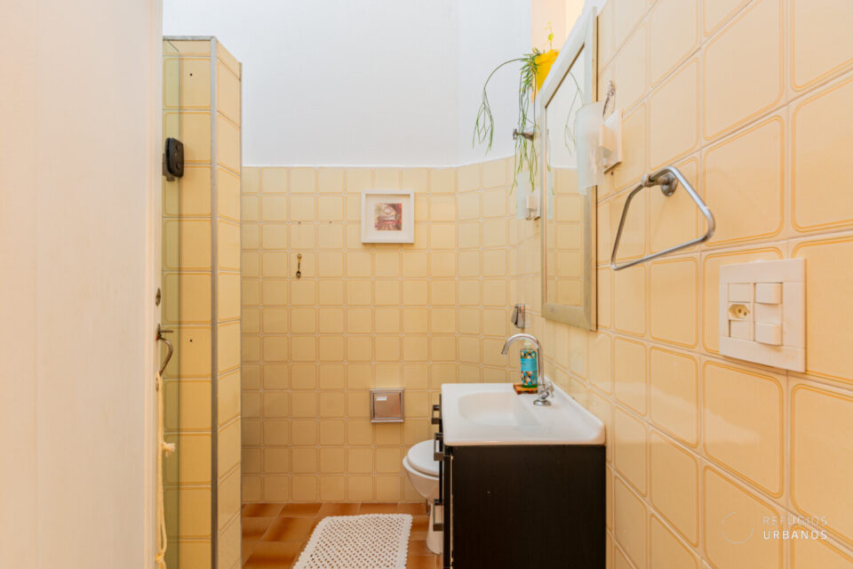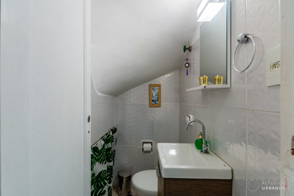 O banheiro social tem pé-direito duplo, ampliando a sensação de espaço e conforto.