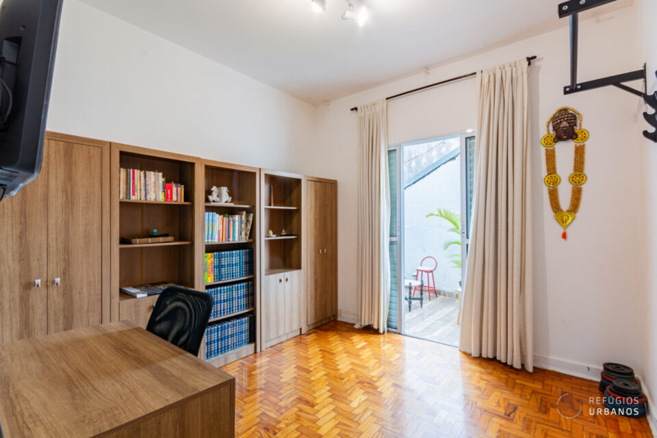 O segundo dormitório, atualmente usado como escritório, se conecta a um deck ensolarado, perfeito para cafés da tarde, encontros tranquilos ou para cultivar suas plantas favoritas.