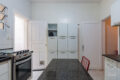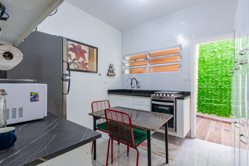 Sob a escada, há um lavabo discreto,  e em seguida, a cozinha bem iluminada e uma área de serviço prática e arejada.