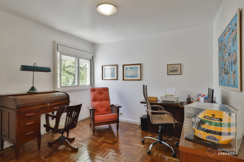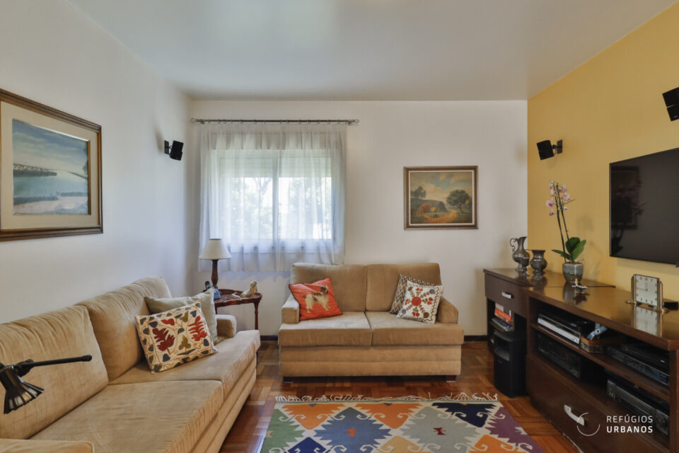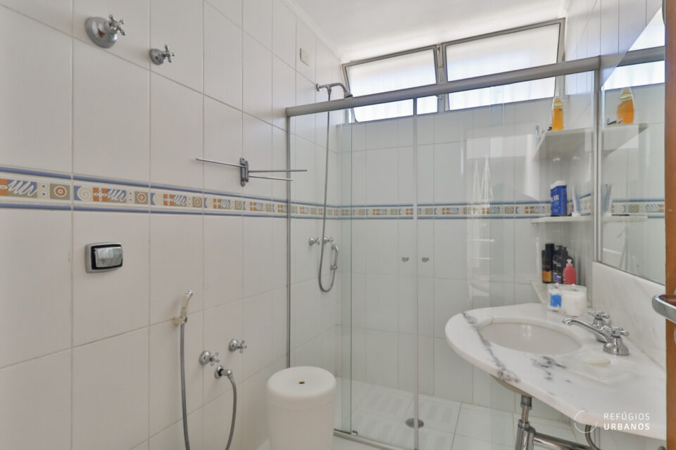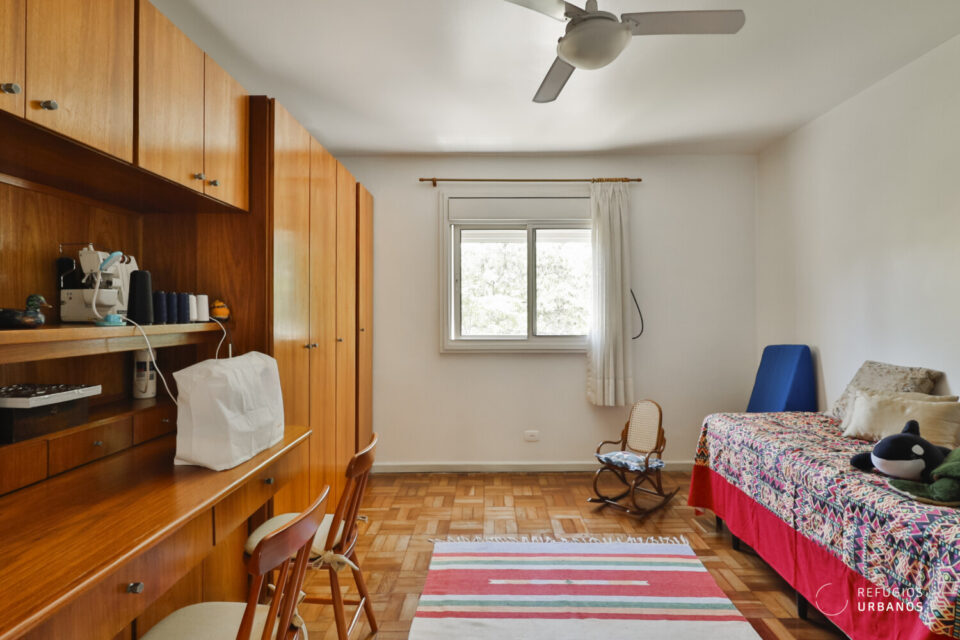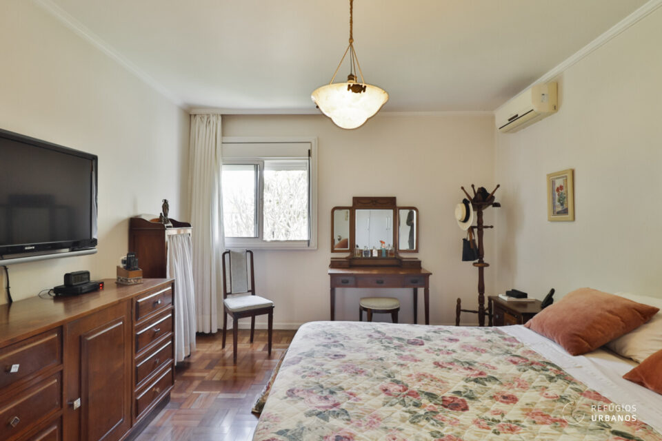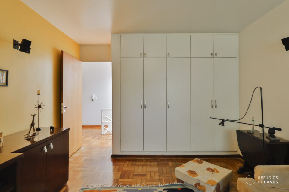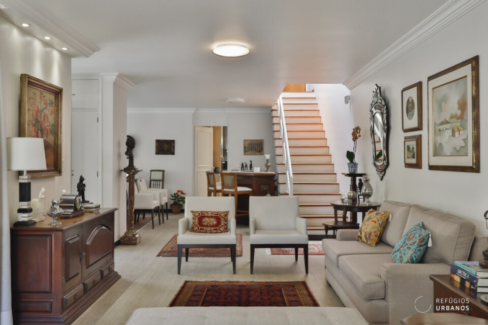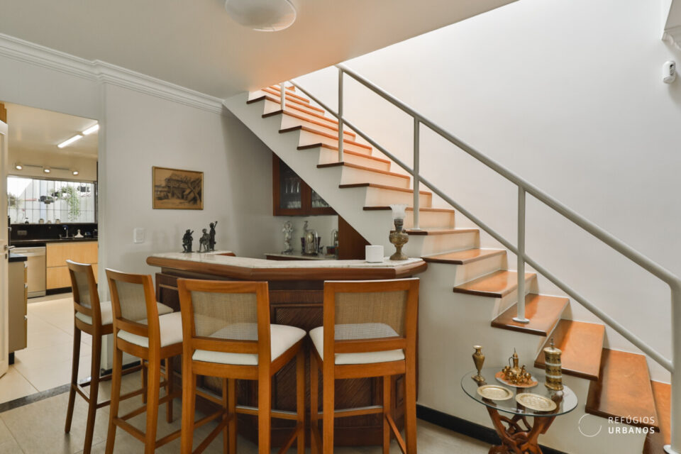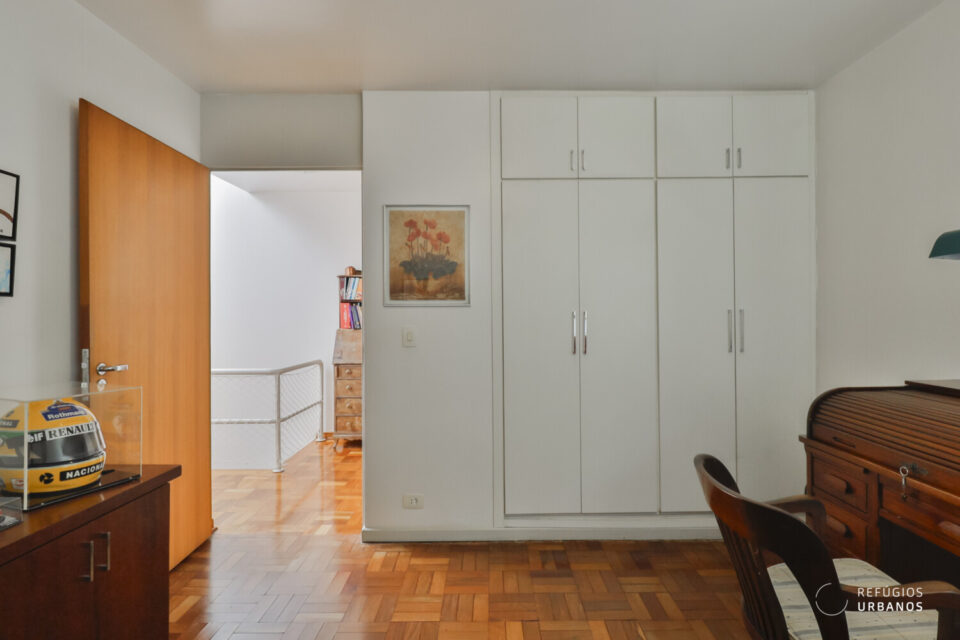 Subindo as escadas, a área íntima revela quatro dormitórios amplos, sendo um deles uma suíte com varanda, perfeita para apreciar o verde logo ao acordar. Todos contam com janelas antirruídos, ótimos armários e piso de madeira, reforçando o toque acolhedor e atemporal da casa. Um segundo banheiro atende os demais quartos com total praticidade.