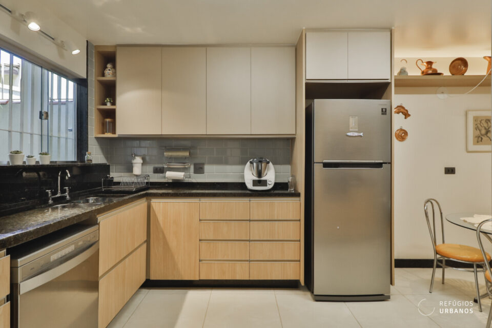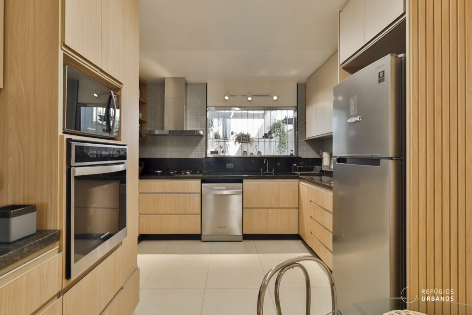 Em seguida, a cozinha, recém reformada se destaca pelo espaço generoso, pela praticidade e pela marcenaria sob medida. É o ambiente ideal para quem gosta de cozinhar sem pressa, com tudo à mão e muito conforto.