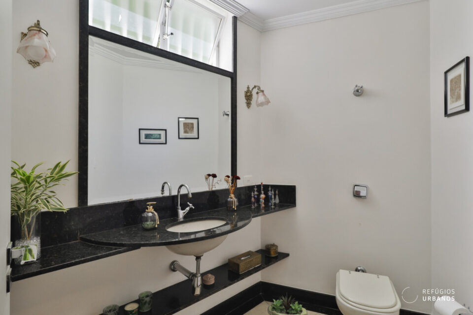 Ao entrar, a ampla sala acomoda três ambientes integrados e voltados para o jardim, permitindo que a luz natural e o frescor das plantas invadam o espaço. O lavabo, estrategicamente posicionado, garante ainda mais comodidade aos visitantes.