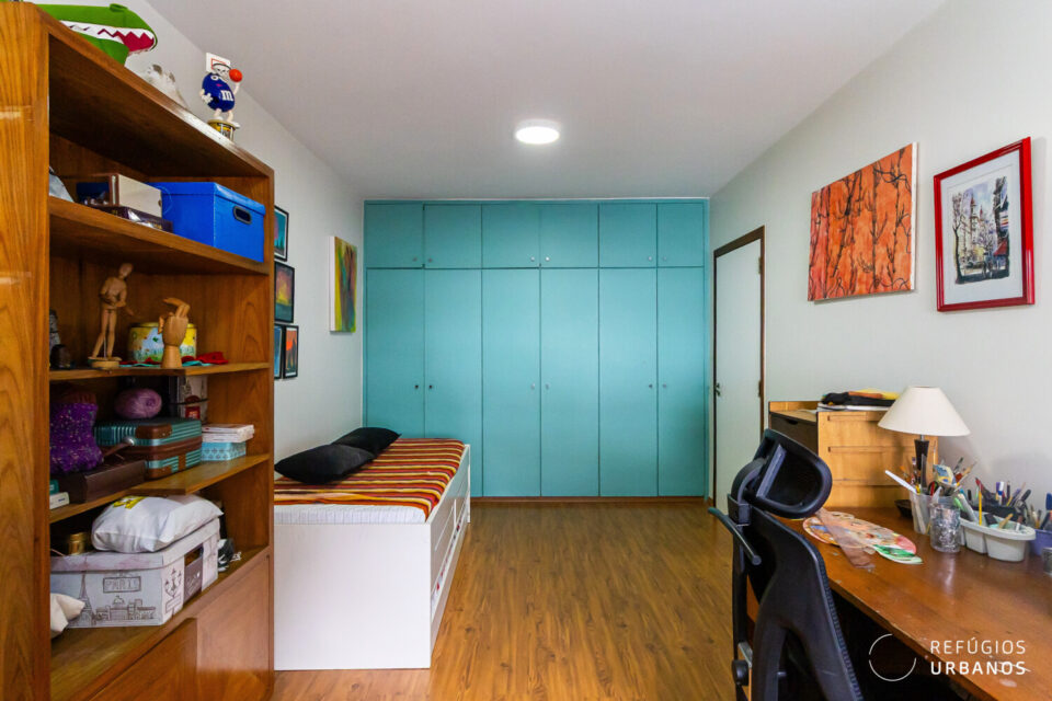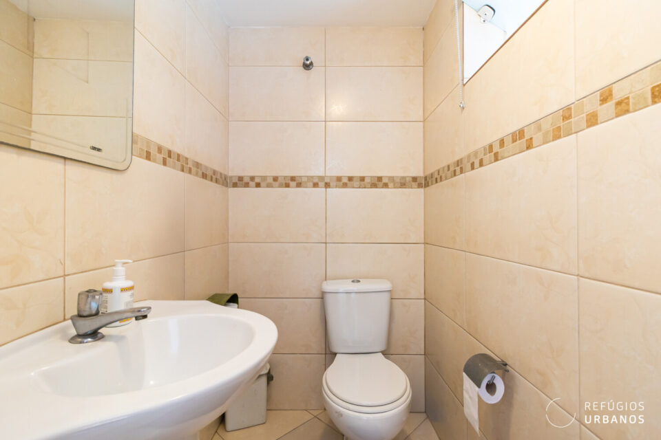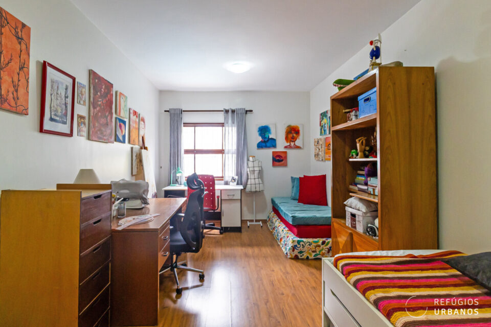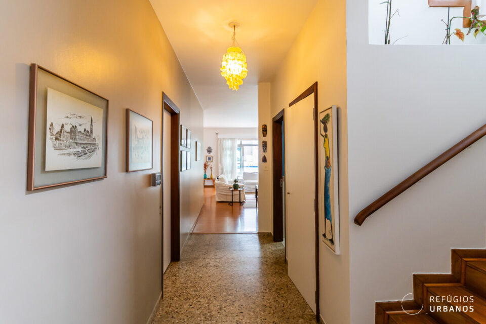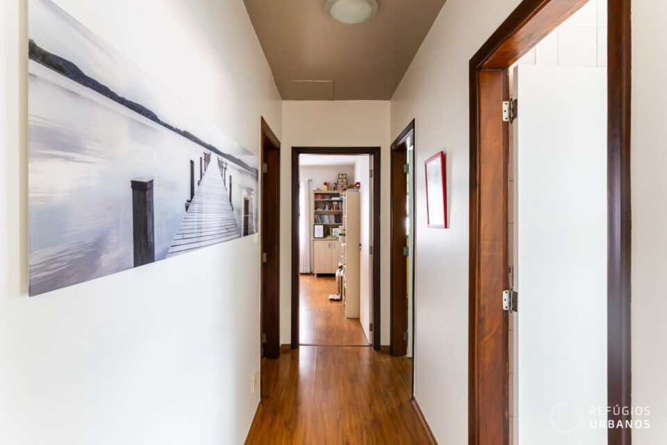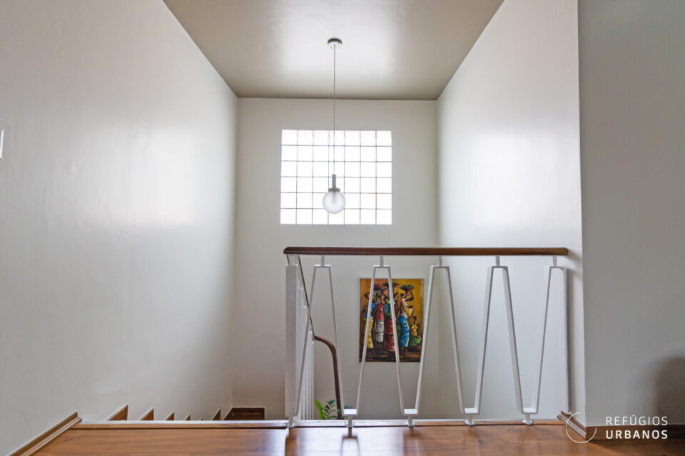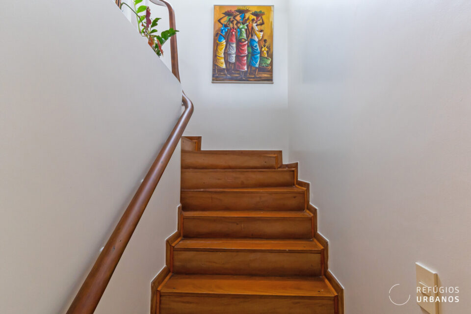 Subindo a charmosa escada de madeira, chegamos à área íntima. Um hall iluminado leva até as duas suítes; todas com armários, e mais dois dormitórios, servidos por um banheiro social.