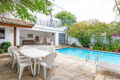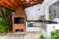 A edícula abriga uma charmosa área gourmet com churrasqueira, ideal para receber amigos e celebrar bons momentos, com vista para o quintal e a piscina.