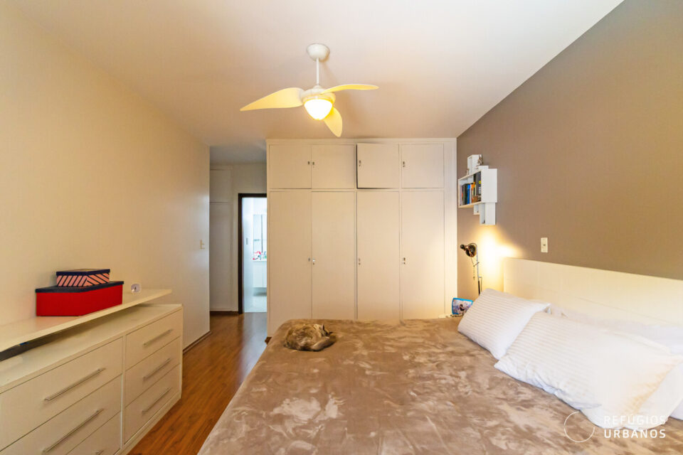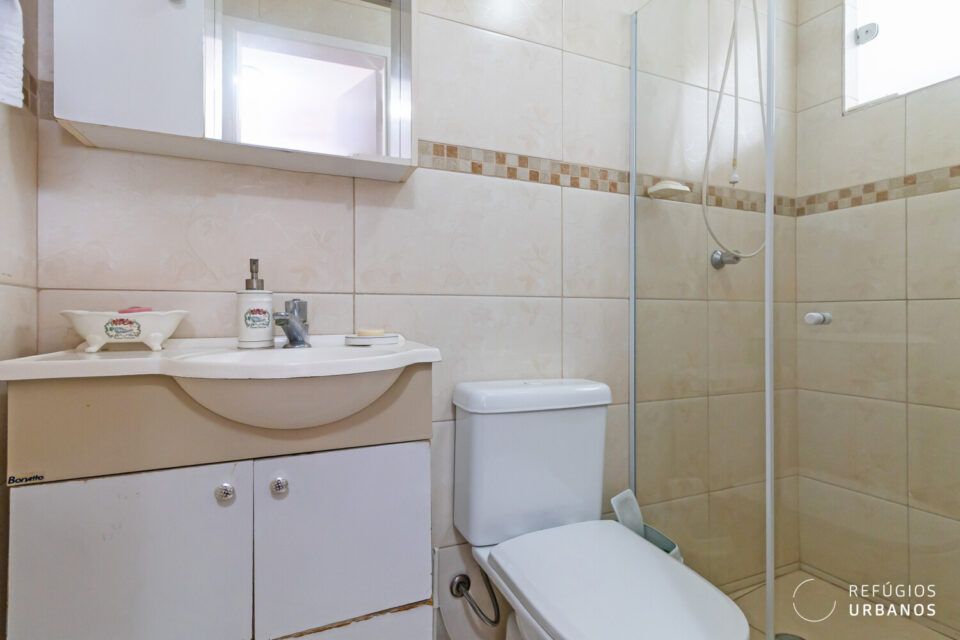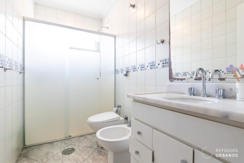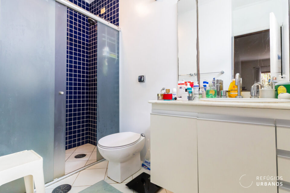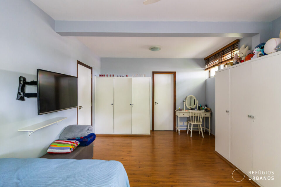 A suíte principal tem um excelente tamanho e vista para árvores do quintal, com muito espaço e um banheiro pra lá de charmoso.