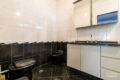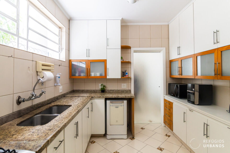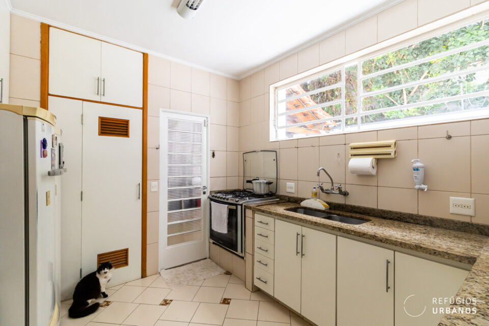 A cozinha, espaçosa e funcional, tem acesso pelo corredor lateral, que também leva ao quintal, à entrada de serviço e à frente do imóvel.