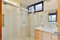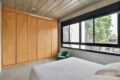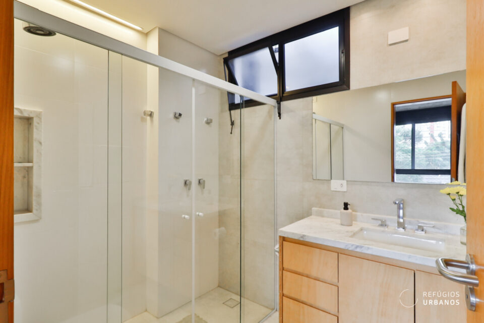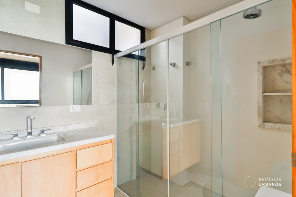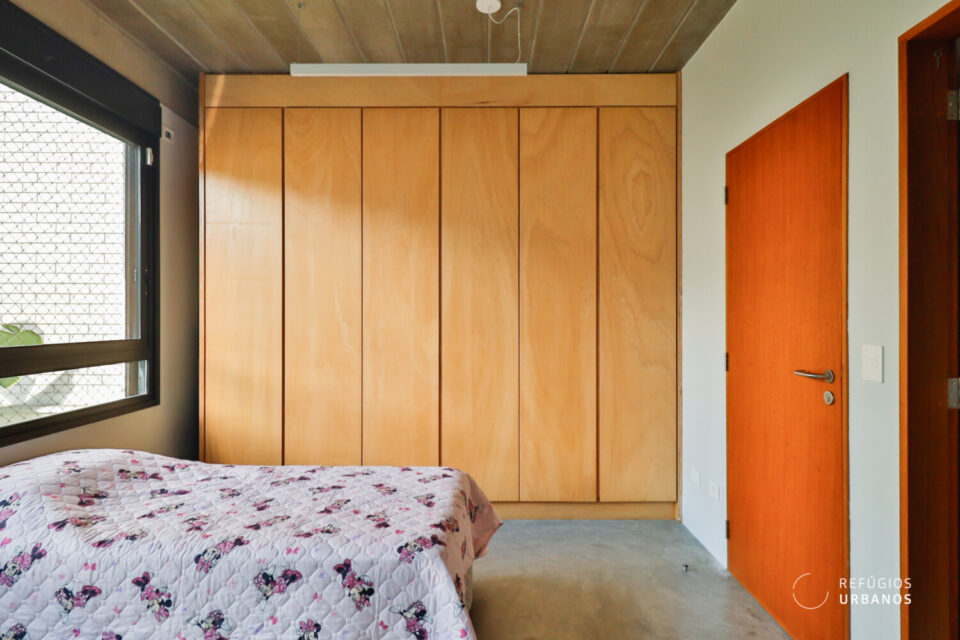Subindo as escadas, chegamos ao pavimento íntimo. Aqui, duas suítes amplas se beneficiam de janelas antirruído que percorrem quase toda a parede, garantindo silêncio e muita luz natural. A marcenaria embutida, cuidadosamente planejada, contribui para ambientes funcionais, organizados e visualmente leves.